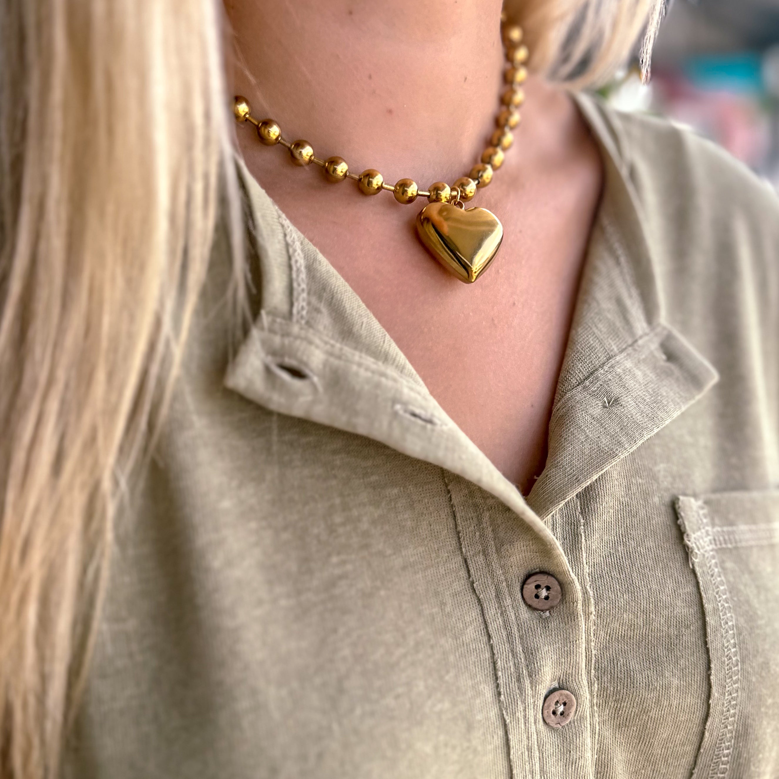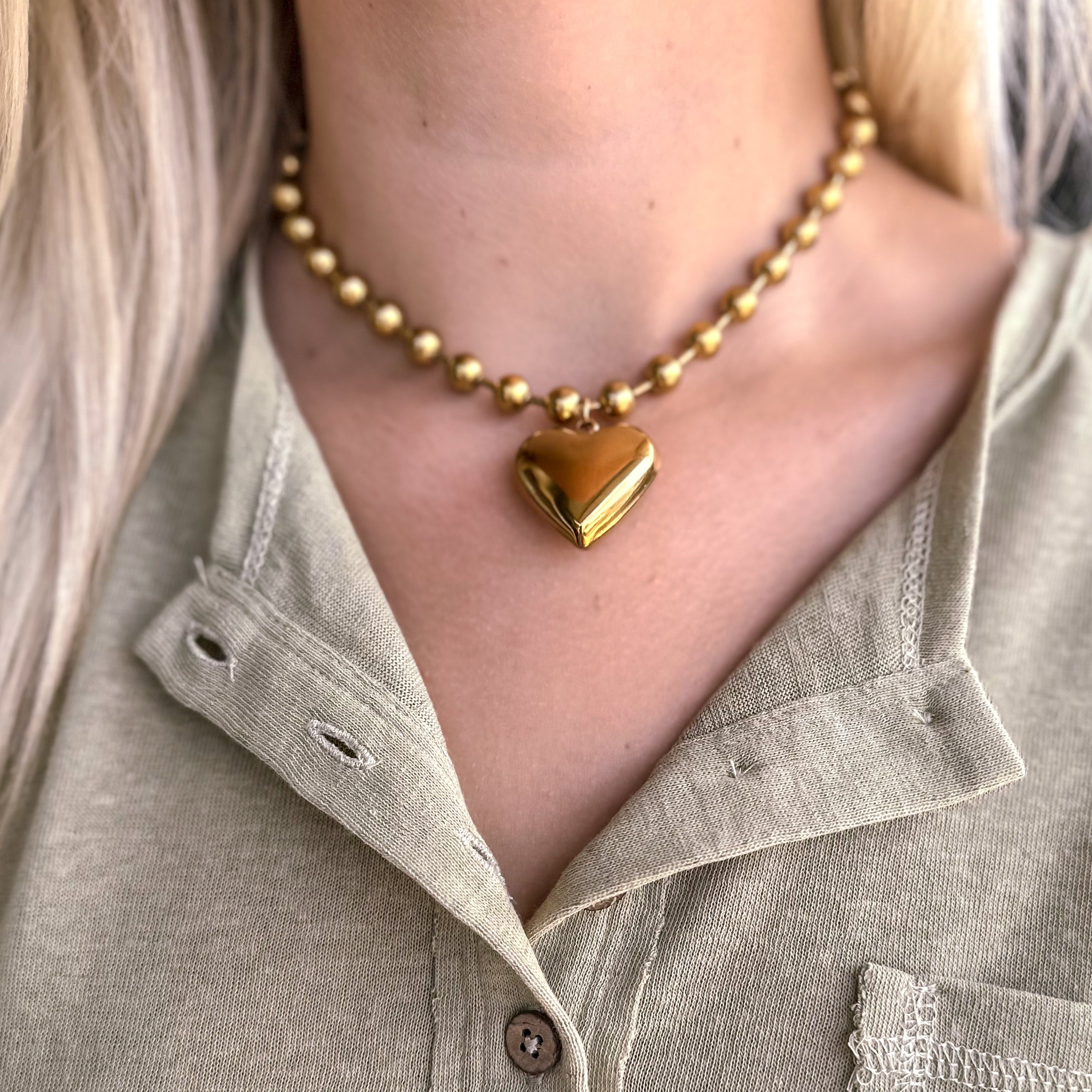 Enhance your outfit with the elegant Bracha: Love In All Necklace. Made with gold beaded hearts, this necklace adds a touch of romance to your look. With its delicate design, it is perfect for any occasion and is sure to make you stand out in style.