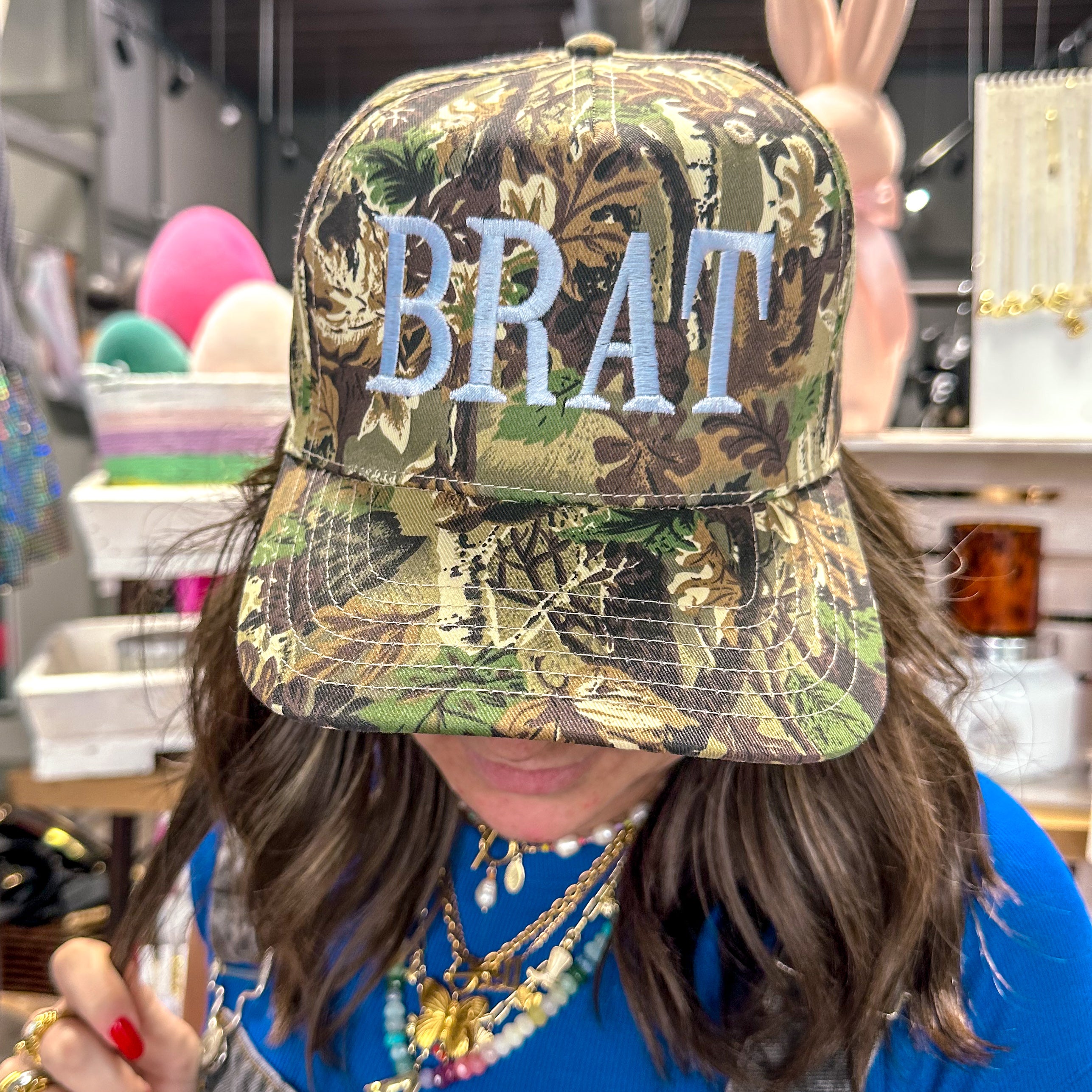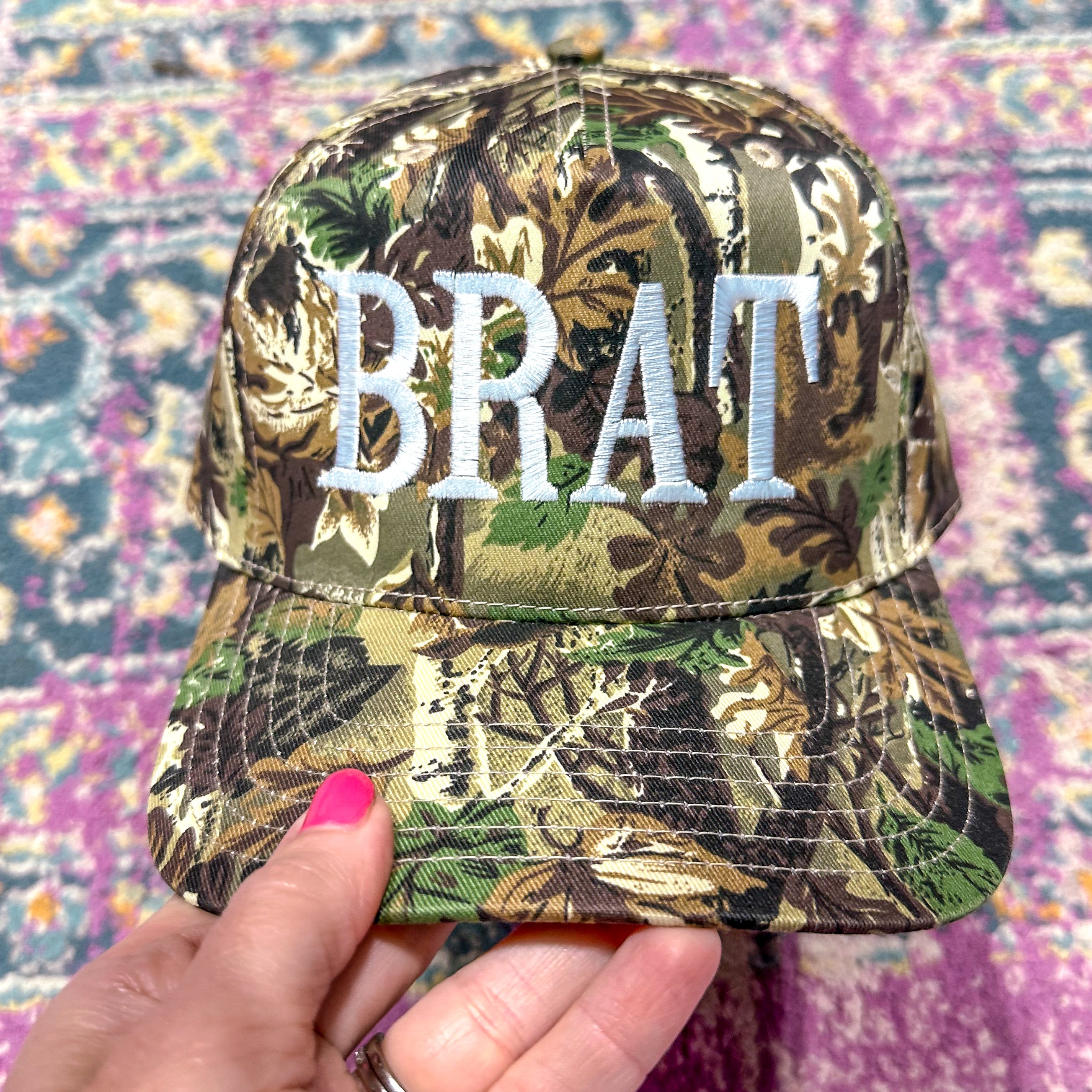 This BRAT Camo Hat is perfect for outdoor enthusiasts. The camo design adds an element of style, while the "brat" stitching in white adds a playful touch. Made with high-quality materials, this trucker hat is both comfortable and durable. Show off your love for the outdoors with this must-have accessory.