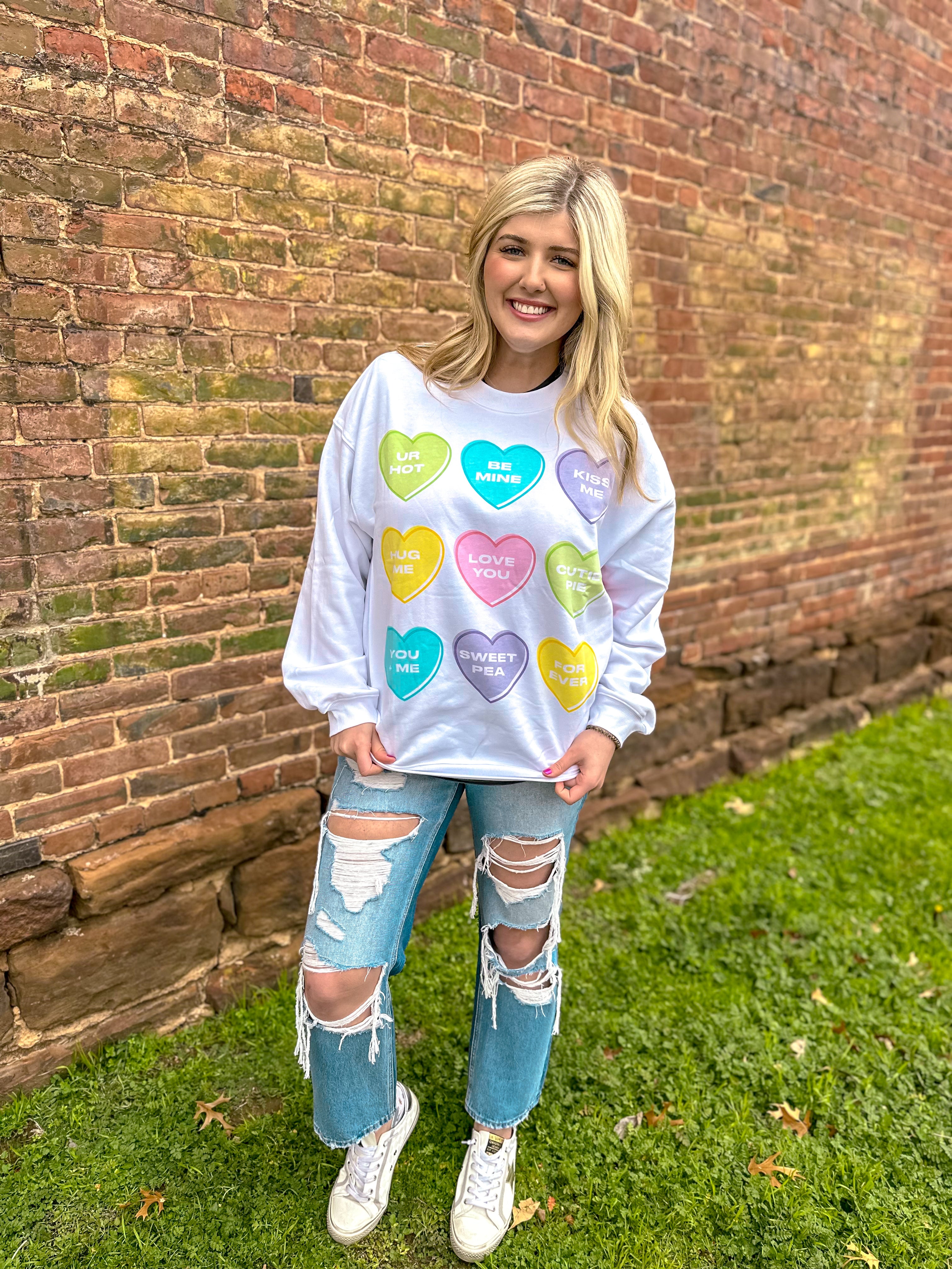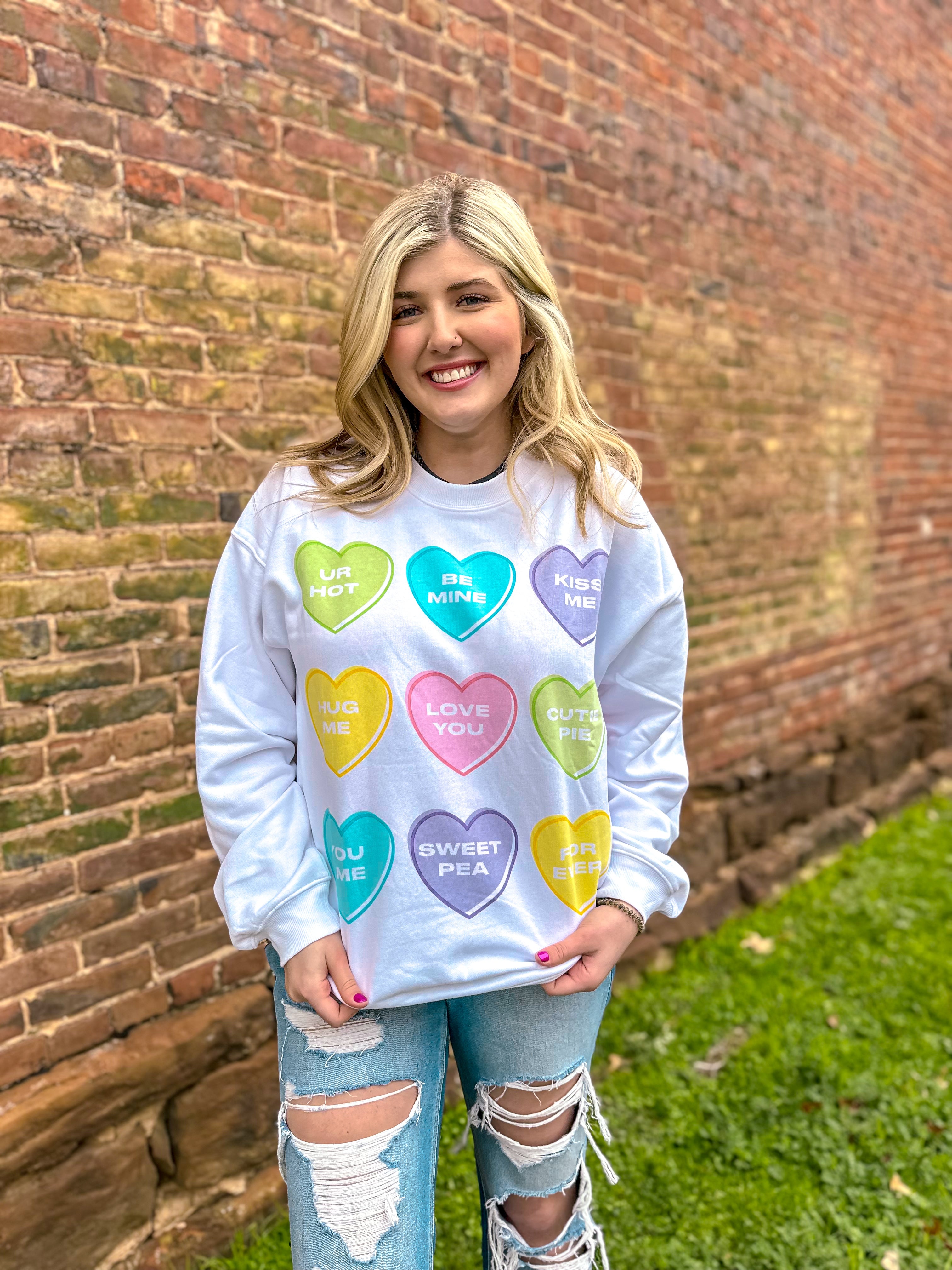 Upgrade your casual wardrobe with the Buddy Love Devon Sweet Sweatshirt. This white sweatshirt showcases playful candy hearts, adding a touch of sweetness to your look. Made with high-quality material, stay comfortable and stylish all day long. Perfect for any occasion, spread love wherever you go with this trendy sweatshirt.