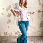 Life's a party, so dress like it in our stunning Blakely top! She features puff sleeves, high-quality material patterned with our new Pearl print, a sweetheart neck line, smocked back, and a peplum silhouette. Style with your fav pair of leather jeans and wedges!