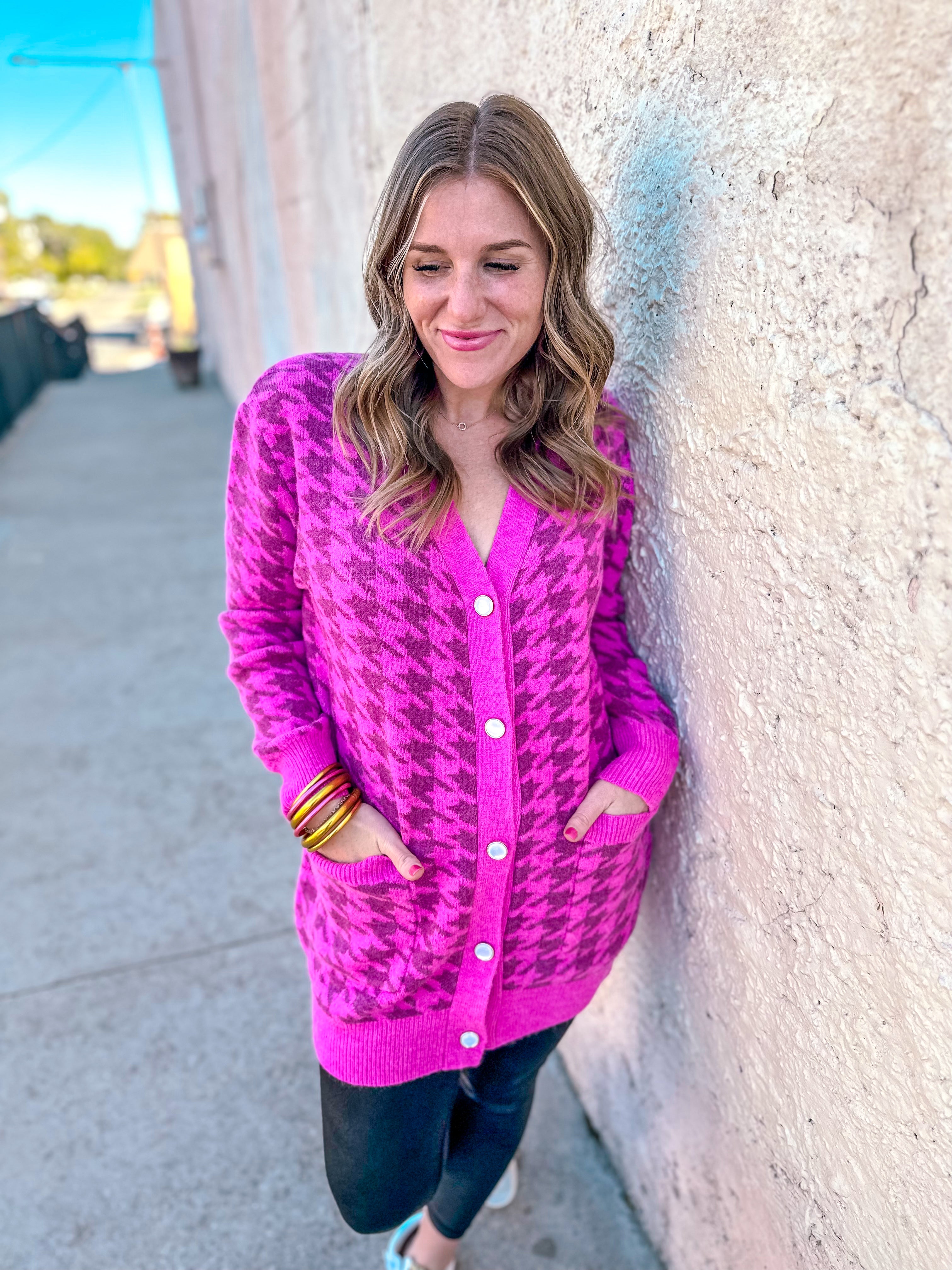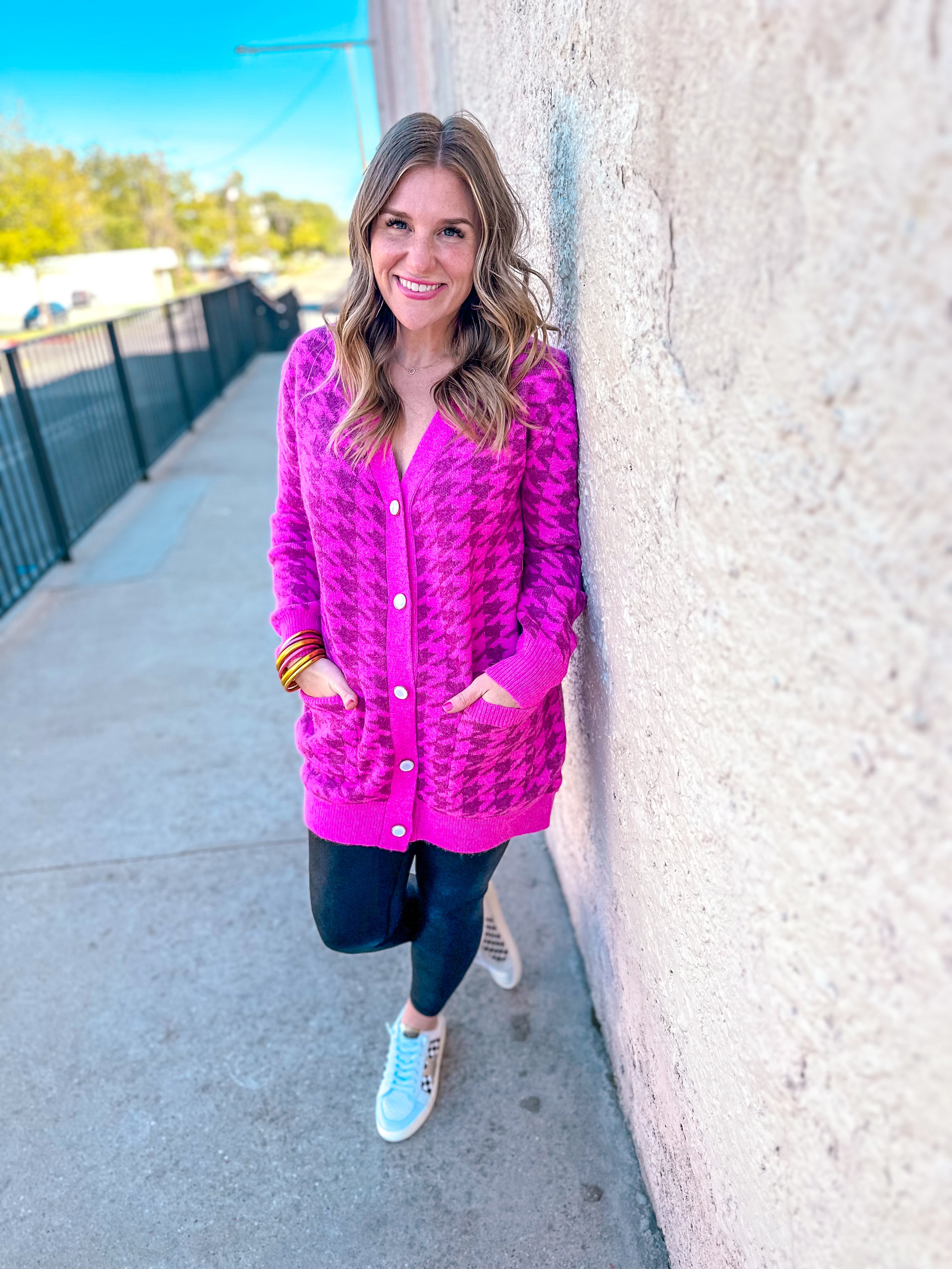 The Buddy Love Twiggy Passion Fruit Cardigan features an oversized design in a bright pink hue. This cardigan provides maximum comfort and warmth with its cozy knit fabric. An eye-catching and unique addition to any wardrobe.