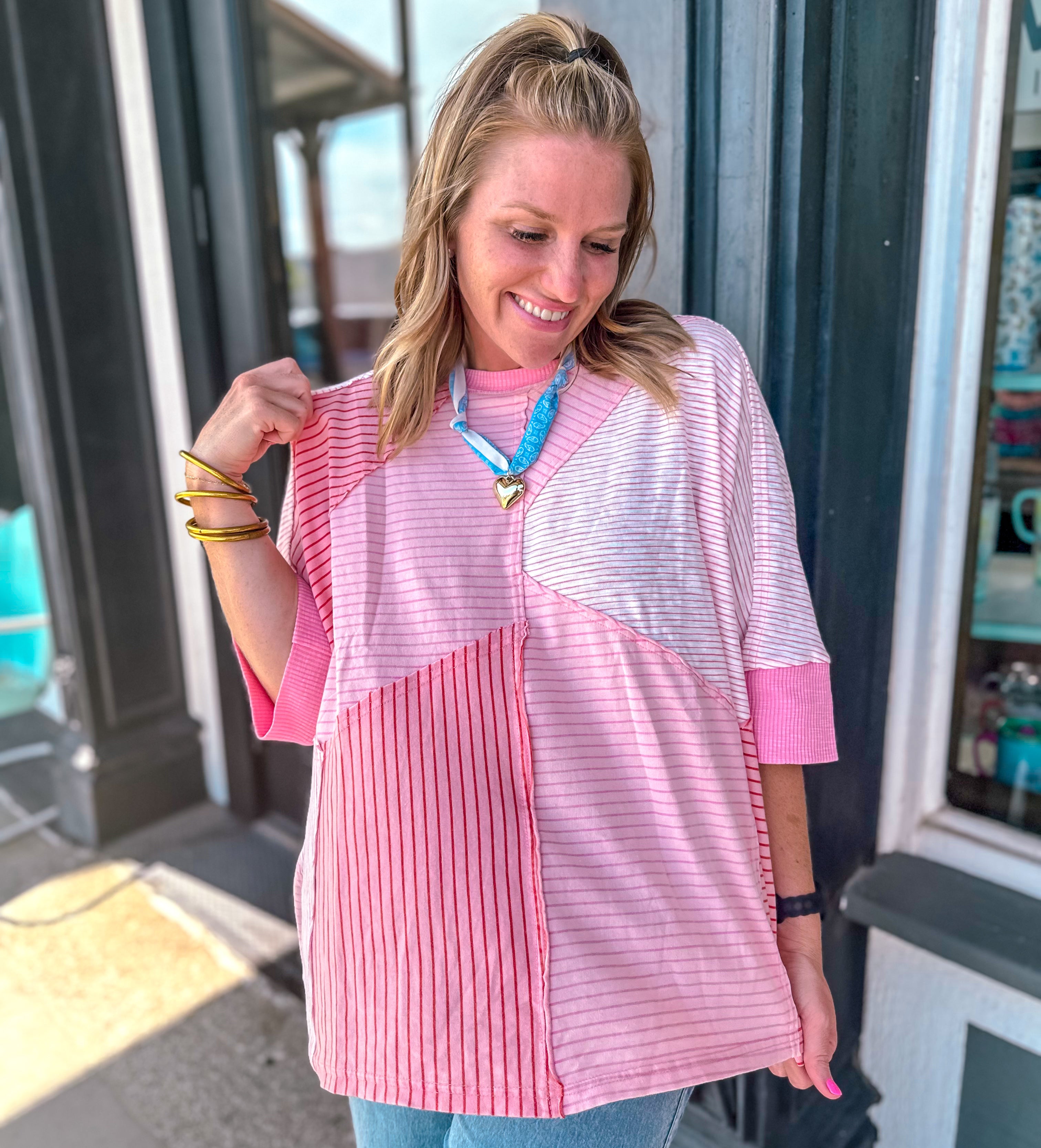 The Candy Pink Boxy Top features a modern boxy silhouette with short sleeves and a stylish stripe mix pattern. Crafted for comfort and effortless style, this top pairs well with casual or dressier outfits, making it a versatile addition to your wardrobe. Its breathable fabric ensures all-day wearability while the unique stripe design adds a subtle yet sophisticated touch.