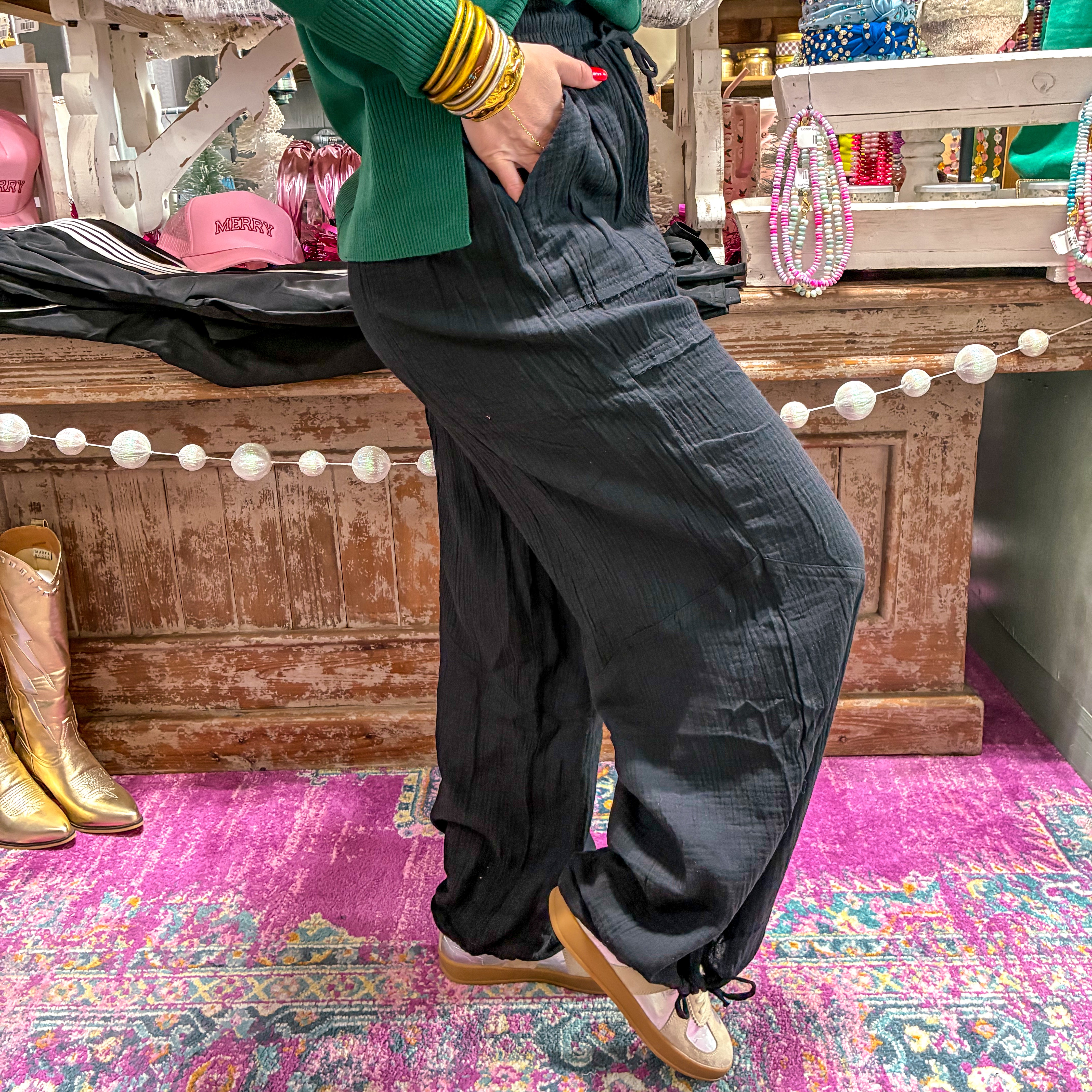 Classic Edge Pants - Black Elevate your wardrobe with these timeless black pants, designed with a refined tie-bottom detail that adds contemporary sophistication. The streamlined silhouette offers versatility for both professional and casual settings, while the tapered tie cuffs create a polished, intentional finish. Crafted for those who appreciate quality construction and understated elegance, these pants transition seamlessly from office to evening wear. A foundational piece that commands attention through its impeccable tailoring and attention to detail.