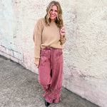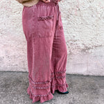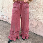 Elevate your wardrobe with these Dreamy Burgundy Ruffle Wide Leg Pants, featuring a sophisticated washed finish that adds depth and character. The romantic ruffle detailing along the legs creates movement and visual interest, while the wide-leg silhouette offers both comfort and a flattering, elongated line. Perfect for layering or wearing solo, this versatile piece transitions seamlessly from casual outings to elevated occasions. The rich burgundy hue pairs effortlessly with neutrals or complementary jewel tones, making it a valuable addition to any style collection.