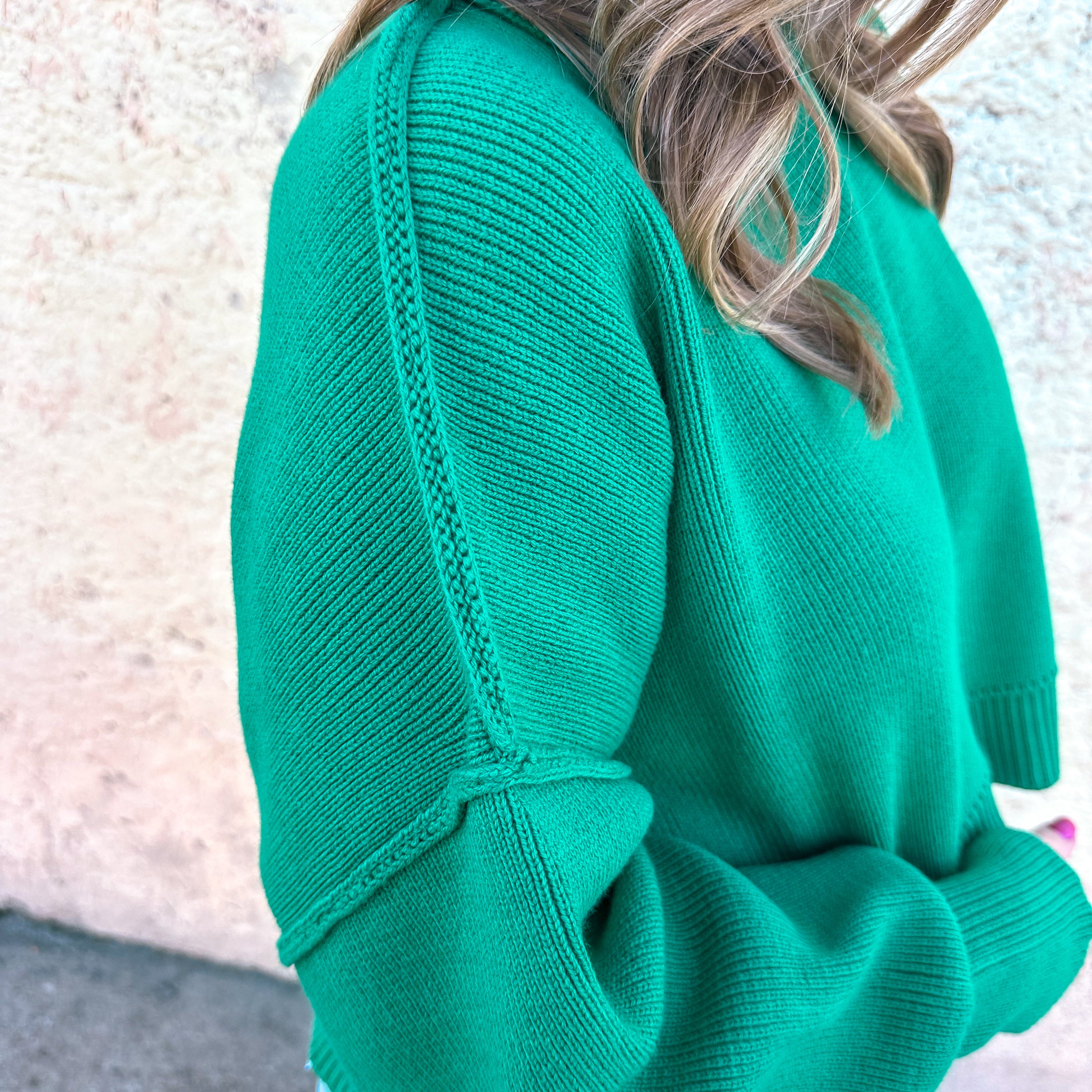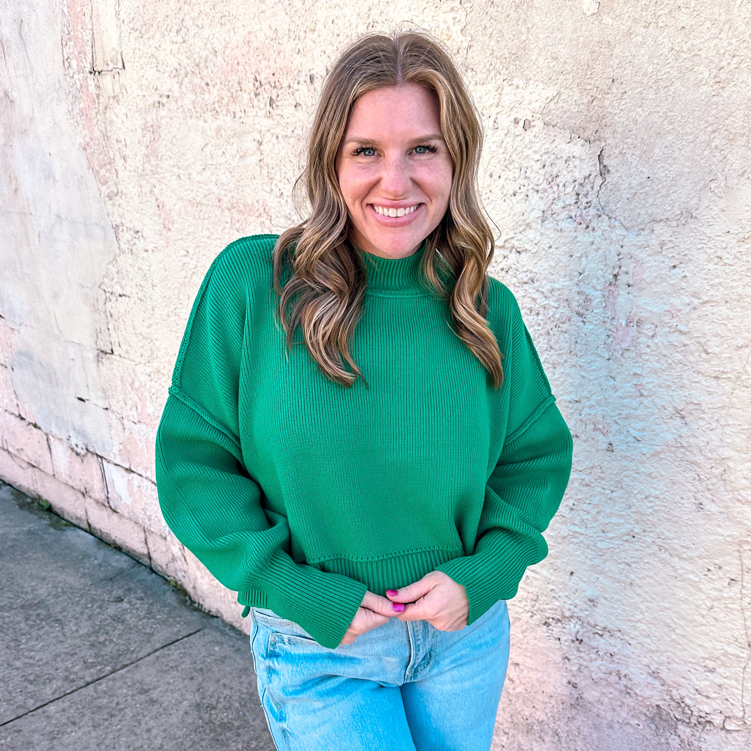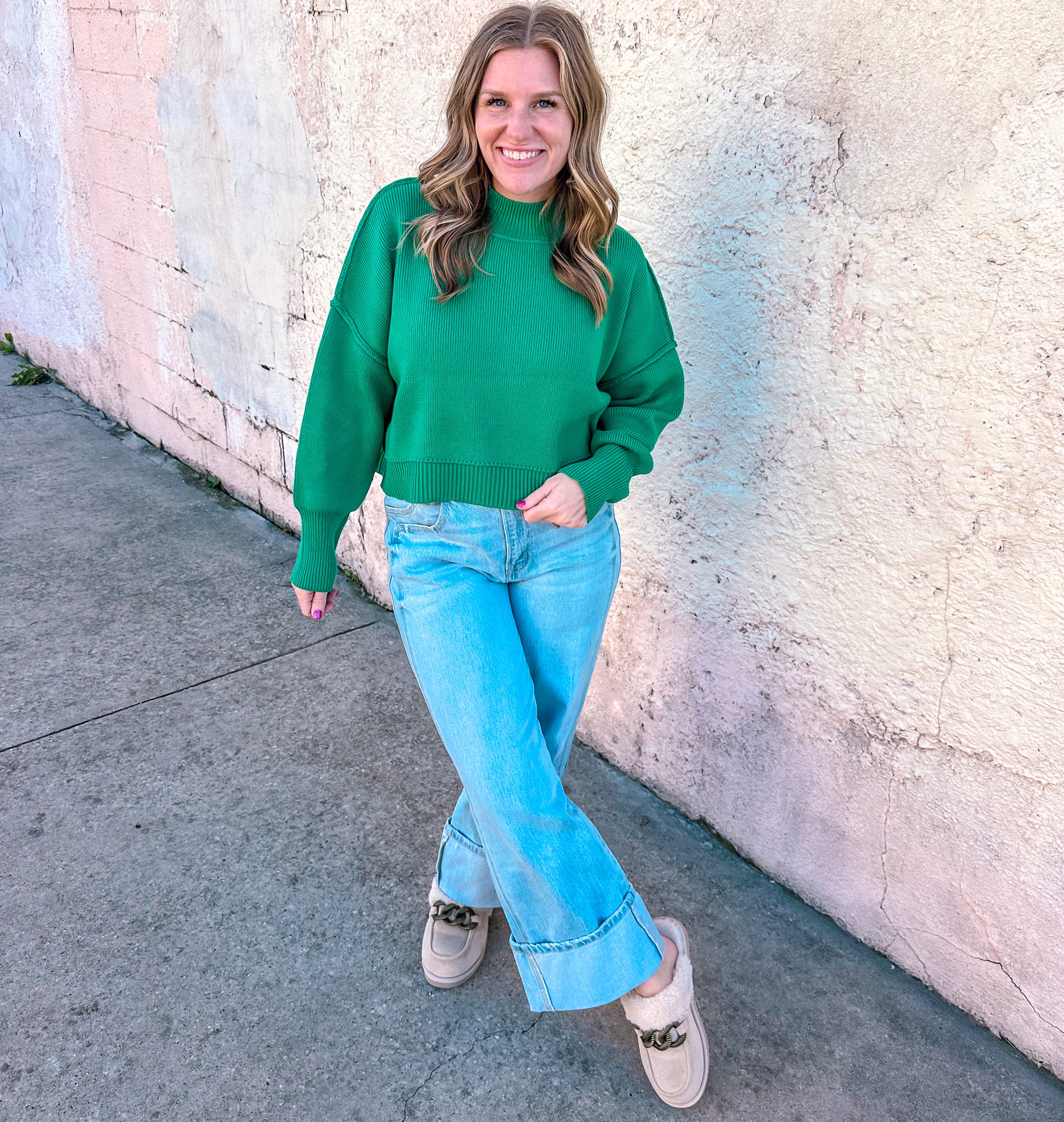 Experience ultimate comfort and style with our Feel It All Top in Kelly Green. This cropped oversized sweater is perfect for any casual or dressy occasion. Made with high-quality fabric, it provides a cozy fit while adding a pop of color to your outfit. Elevate your wardrobe with this must-have piece.