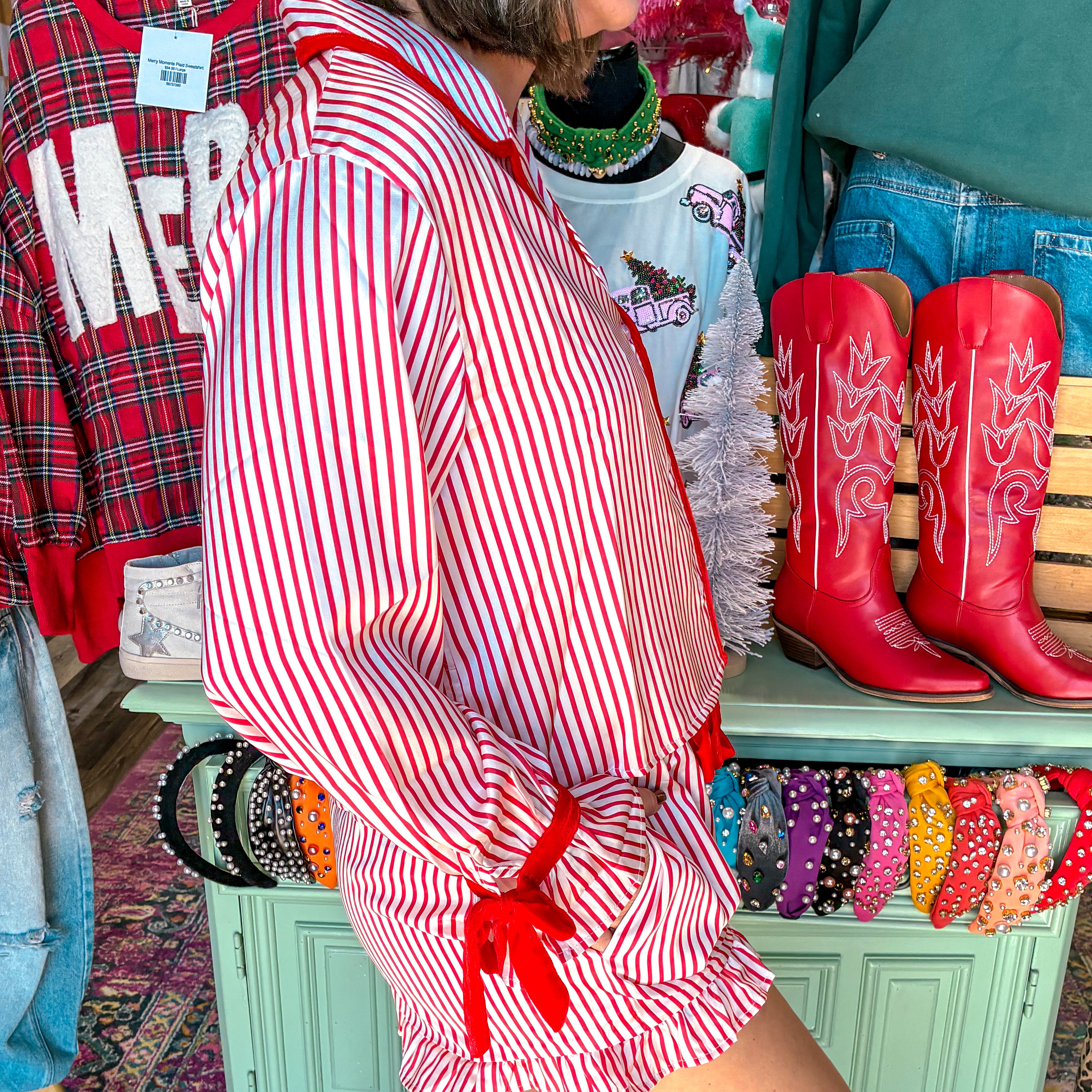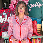 Experience refined comfort with the Merry Velvet Trim Pajamas in Red. Crafted with detailed velvet binding and subtle stripe patterns, these pajamas offer an elegant touch enhanced by delicate mini embroidery. Ideal for those who appreciate sophisticated loungewear, they combine softness with meticulous design, ensuring both style and ease during restful nights.
