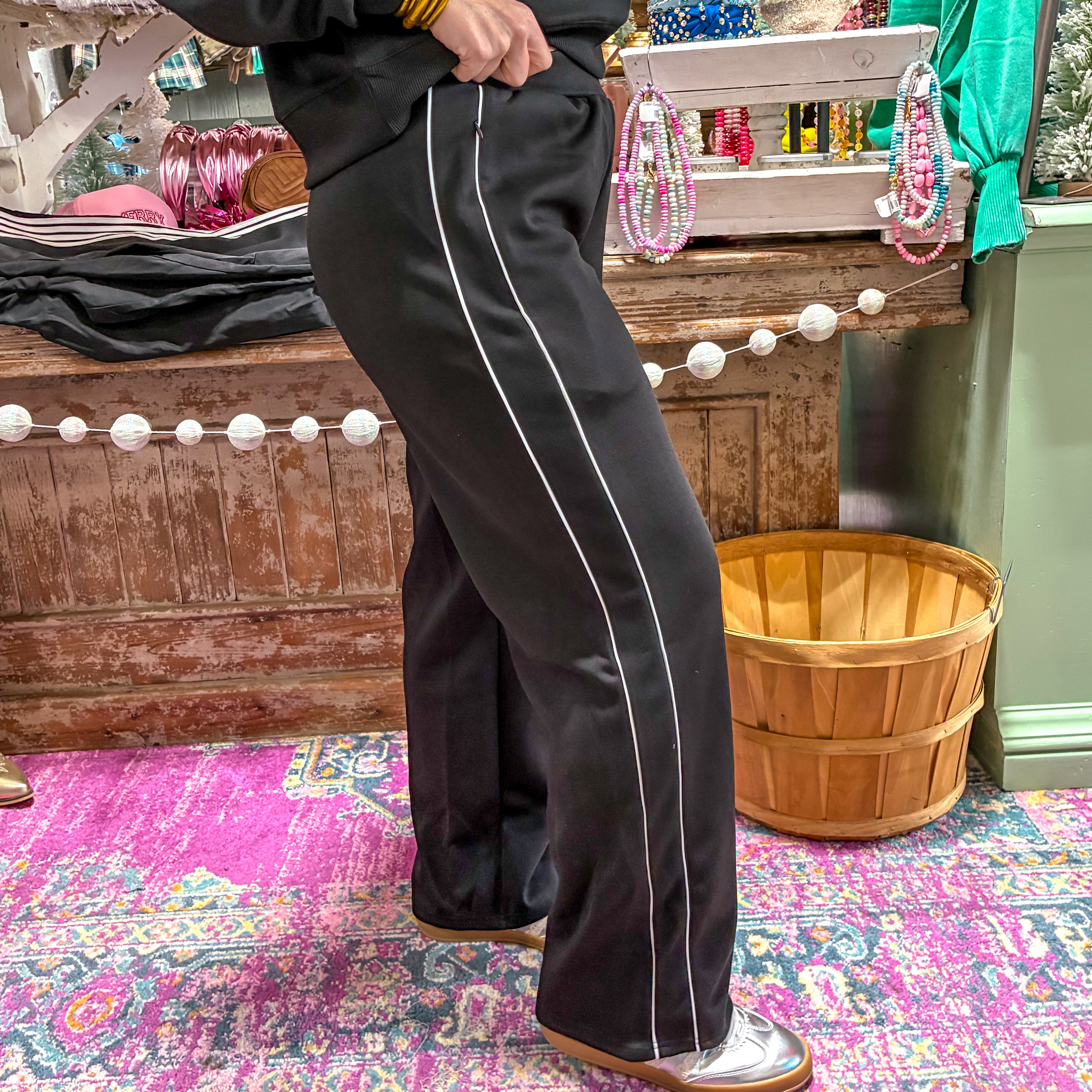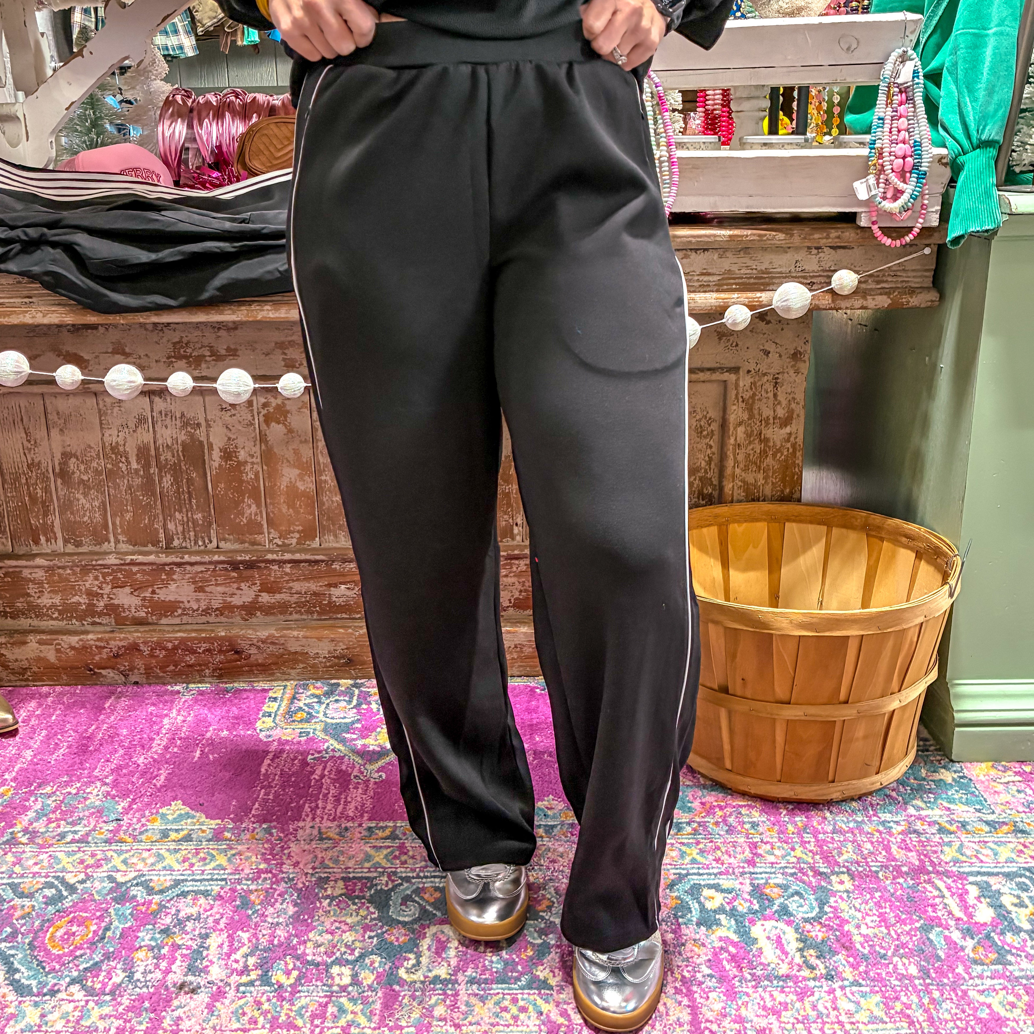 The Midnight Basics Set delivers understated sophistication with a versatile two-piece ensemble. Black bottoms featuring a crisp white side stripe create visual interest while maintaining a sleek silhouette, paired seamlessly with a classic black sweater. This coordinated set offers effortless styling for those who appreciate refined minimalism. The monochromatic palette with strategic contrast ensures this set transitions seamlessly from casual weekends to polished everyday wear, making it an essential foundation piece for any wardrobe.