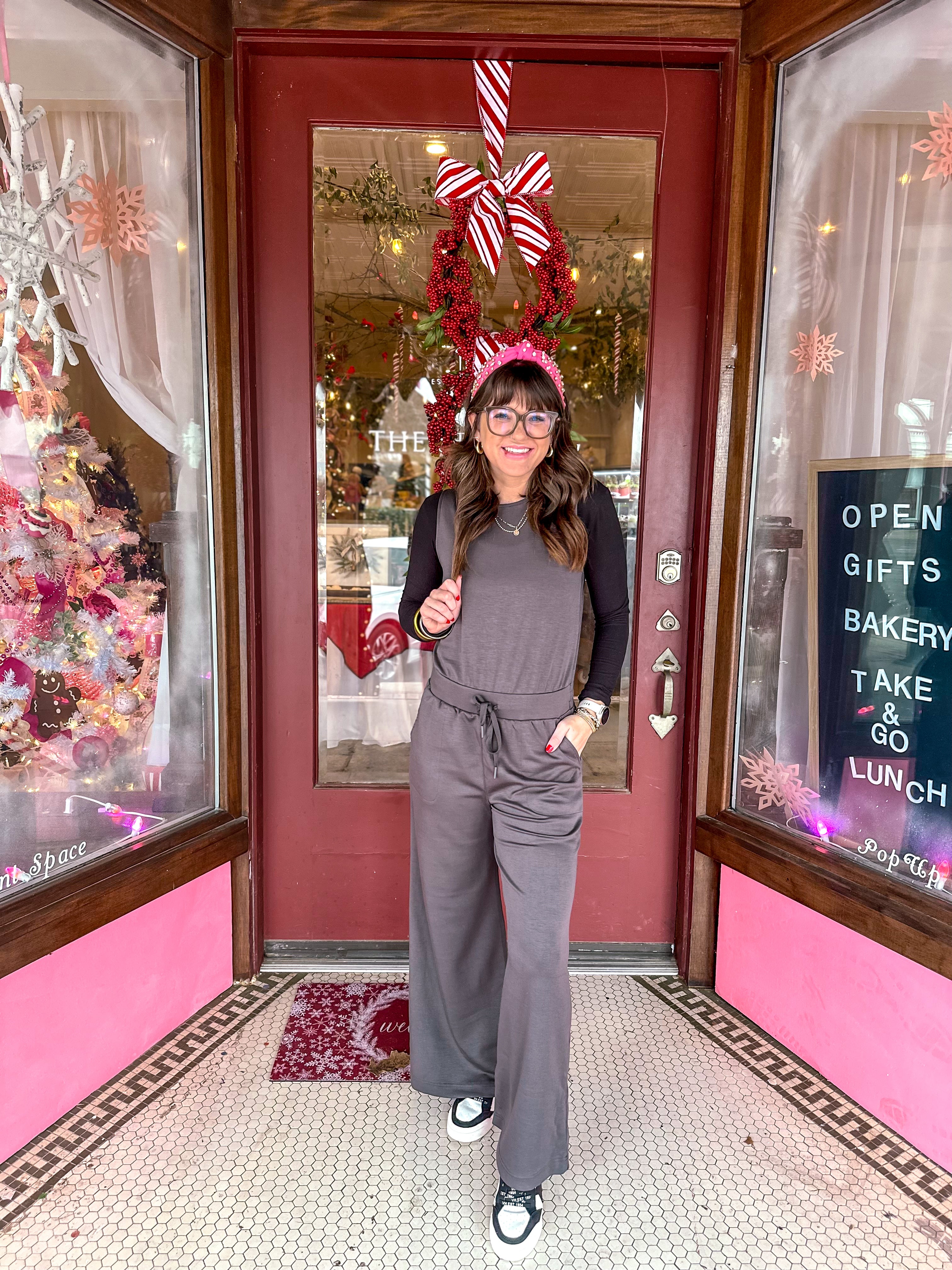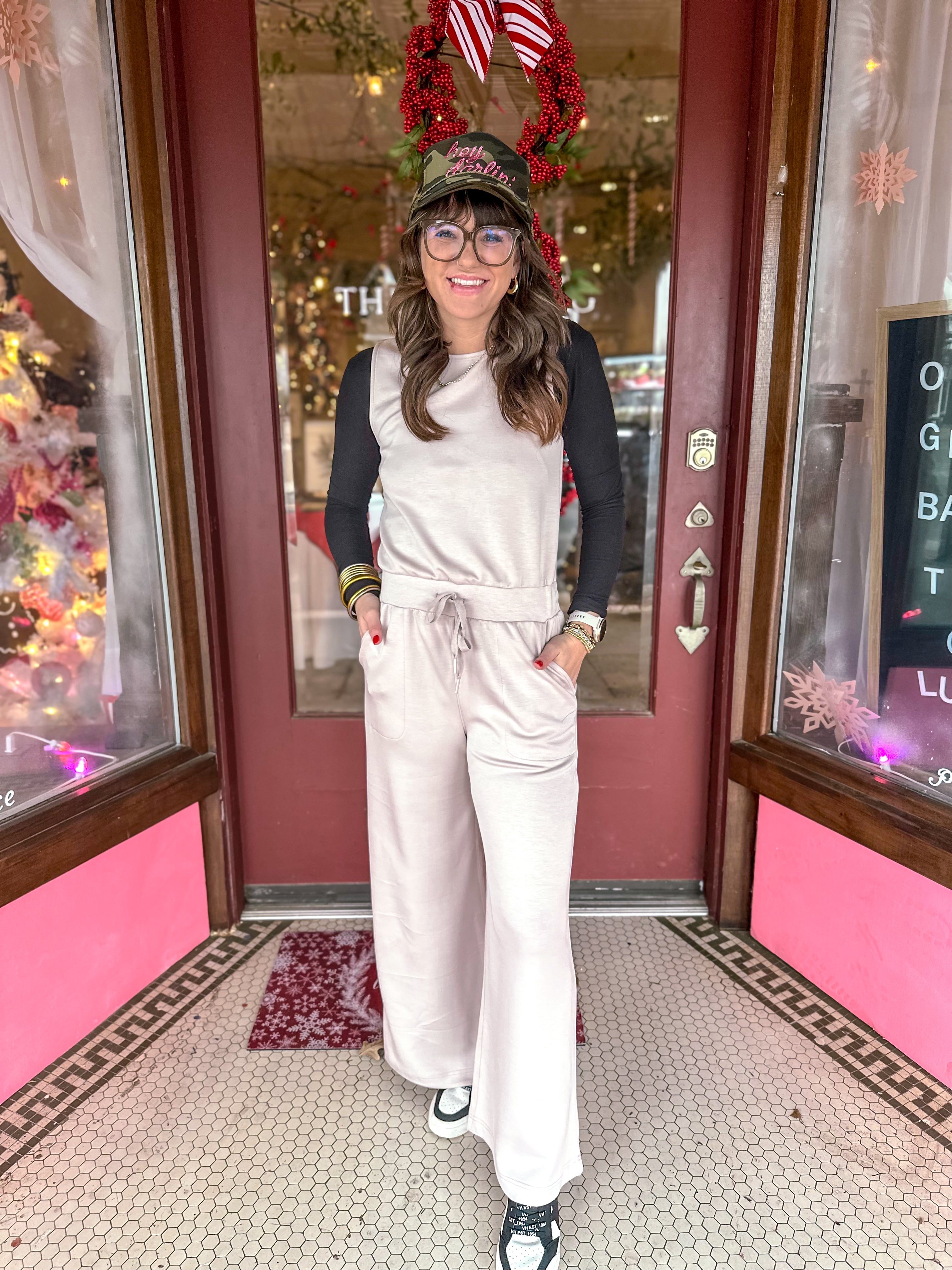 Introducing the New In Town Jumpsuit: a wide leg scuba jumpsuit with an elastic waistband and side pockets for comfort and convenience. Designed with a drawstring back keyhole with a button closure for a secure fit. Perfect for any occasion.
