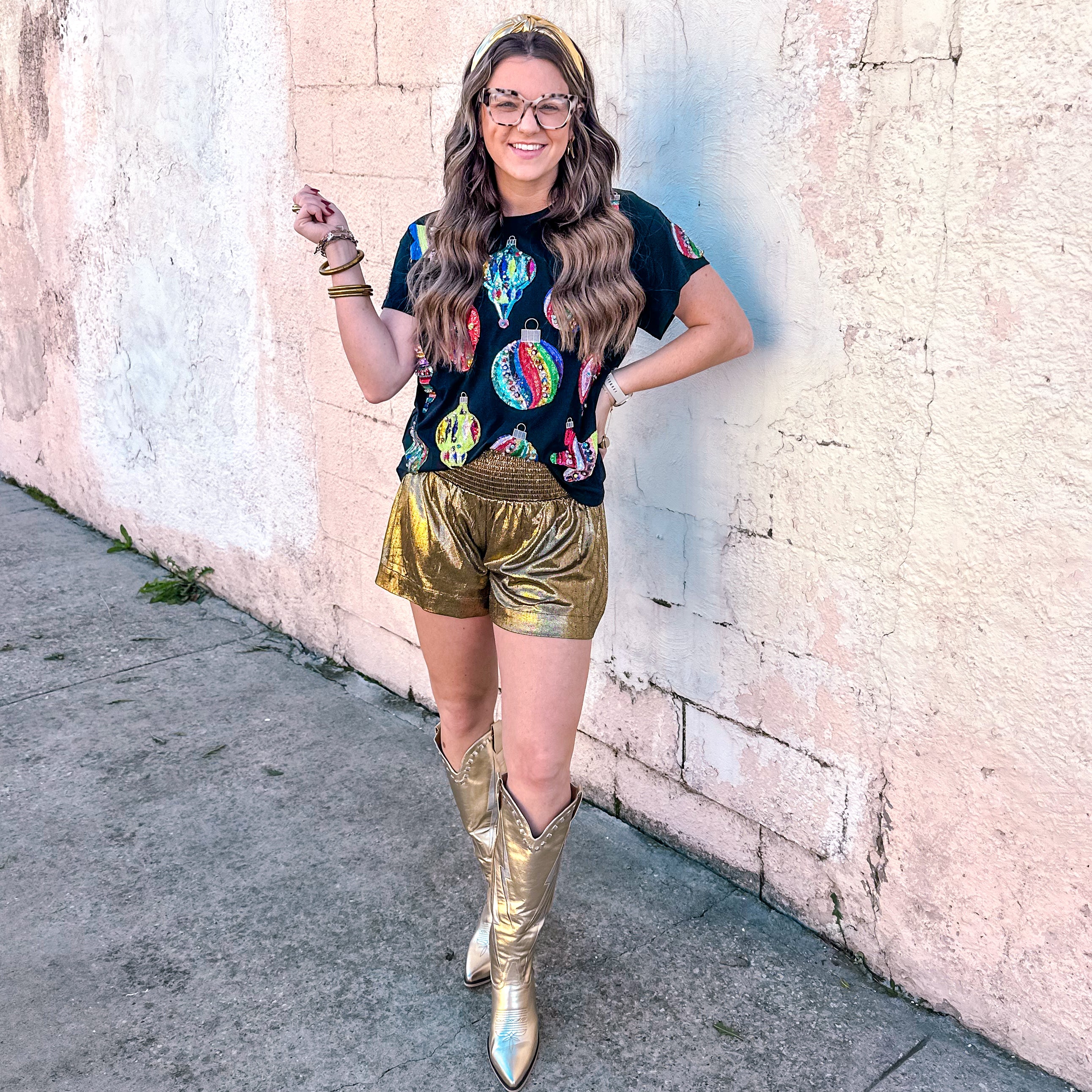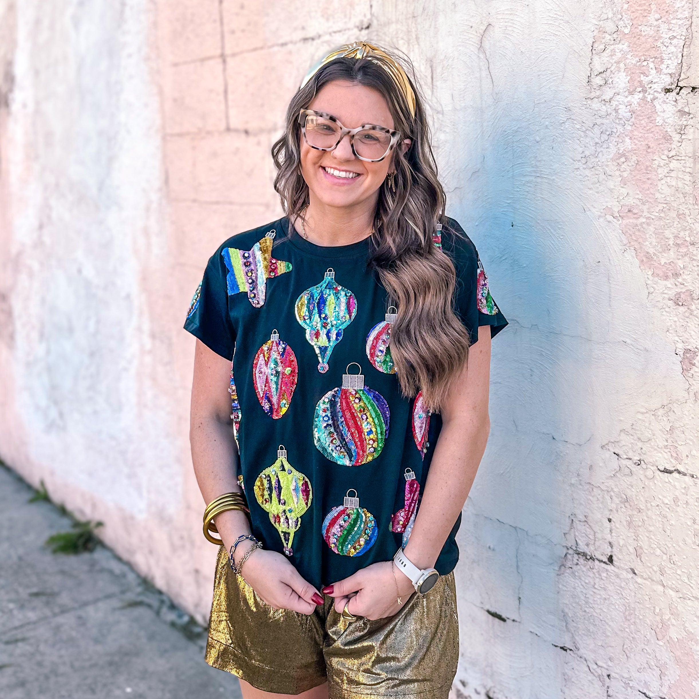 Stay stylish and sparkly with our Queen Of Sparkles tee. This black tee is adorned with an array of multi colored ornaments, adding a touch of fun and glamour to any outfit. Crafted with high quality materials, this tee is sure to become a staple in your wardrobe.
