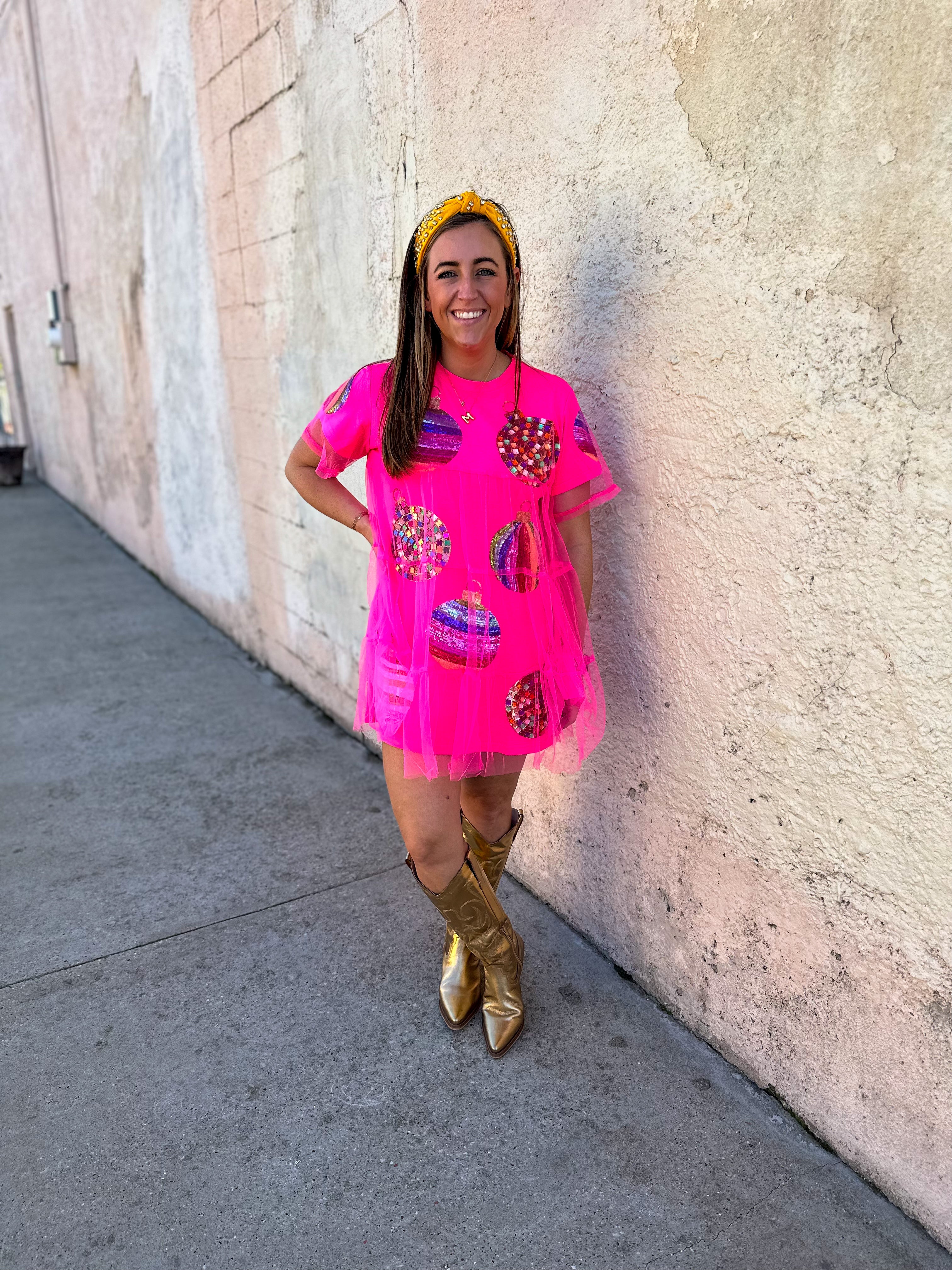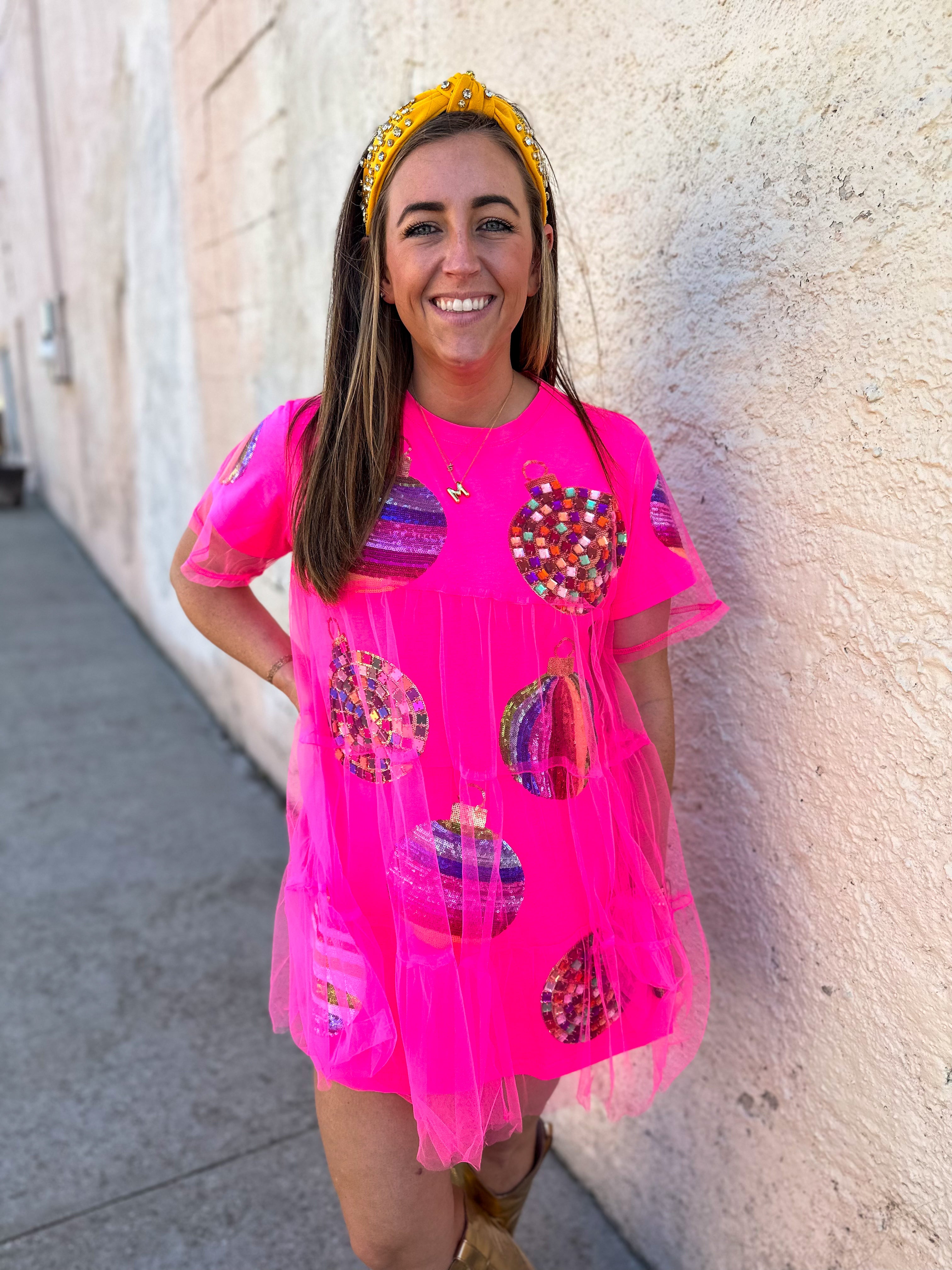 Queen of Sparkles: Neon Pink Mesh Overlay Ornament Dress
