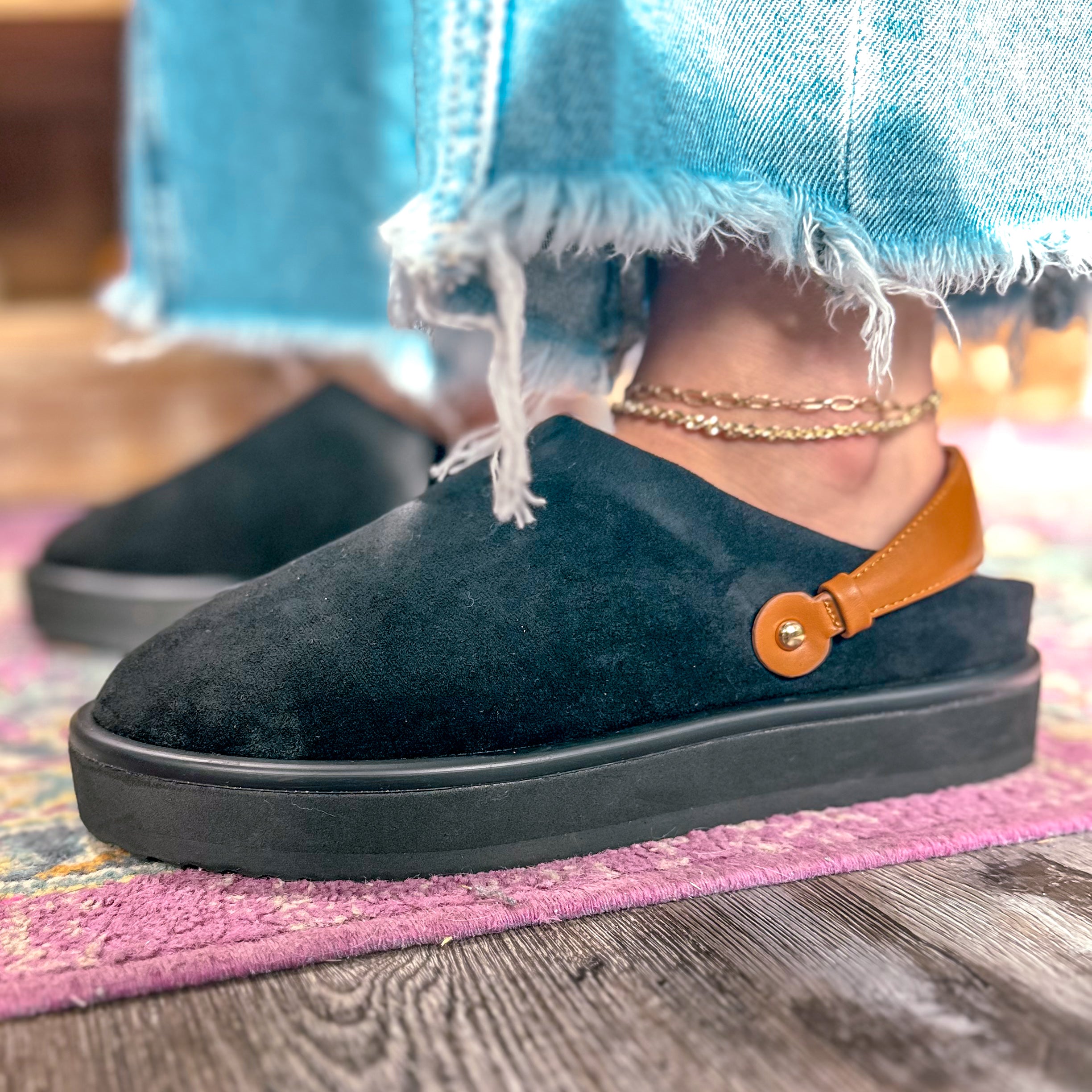 The Quinn Black Mule is a stylish and versatile shoe with a touch of elegance. It features a classic black color and a brown strap for added sophistication. Perfect for any occasion, this mule will elevate any outfit and make you stand out on Instagram.