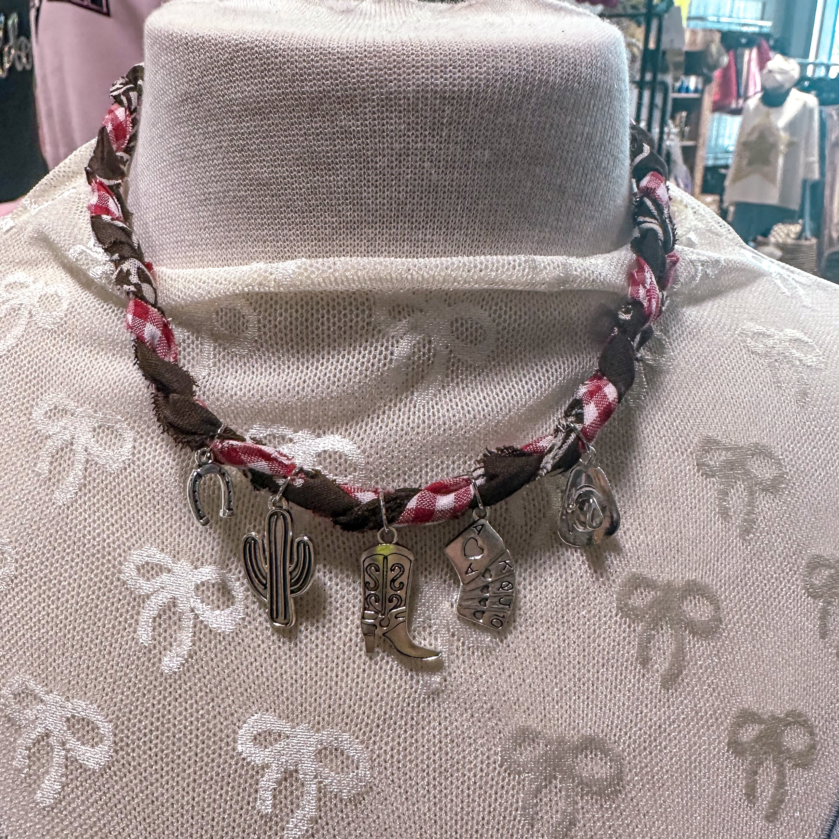 The Rustic Charm Bandana Necklace features a distinctive red and white plaid braided design accented with a brown bandana strip. Silver western-themed charms add an authentic touch, making it a refined accessory that complements casual and country-inspired styles with expert craftsmanship and attention to detail.
