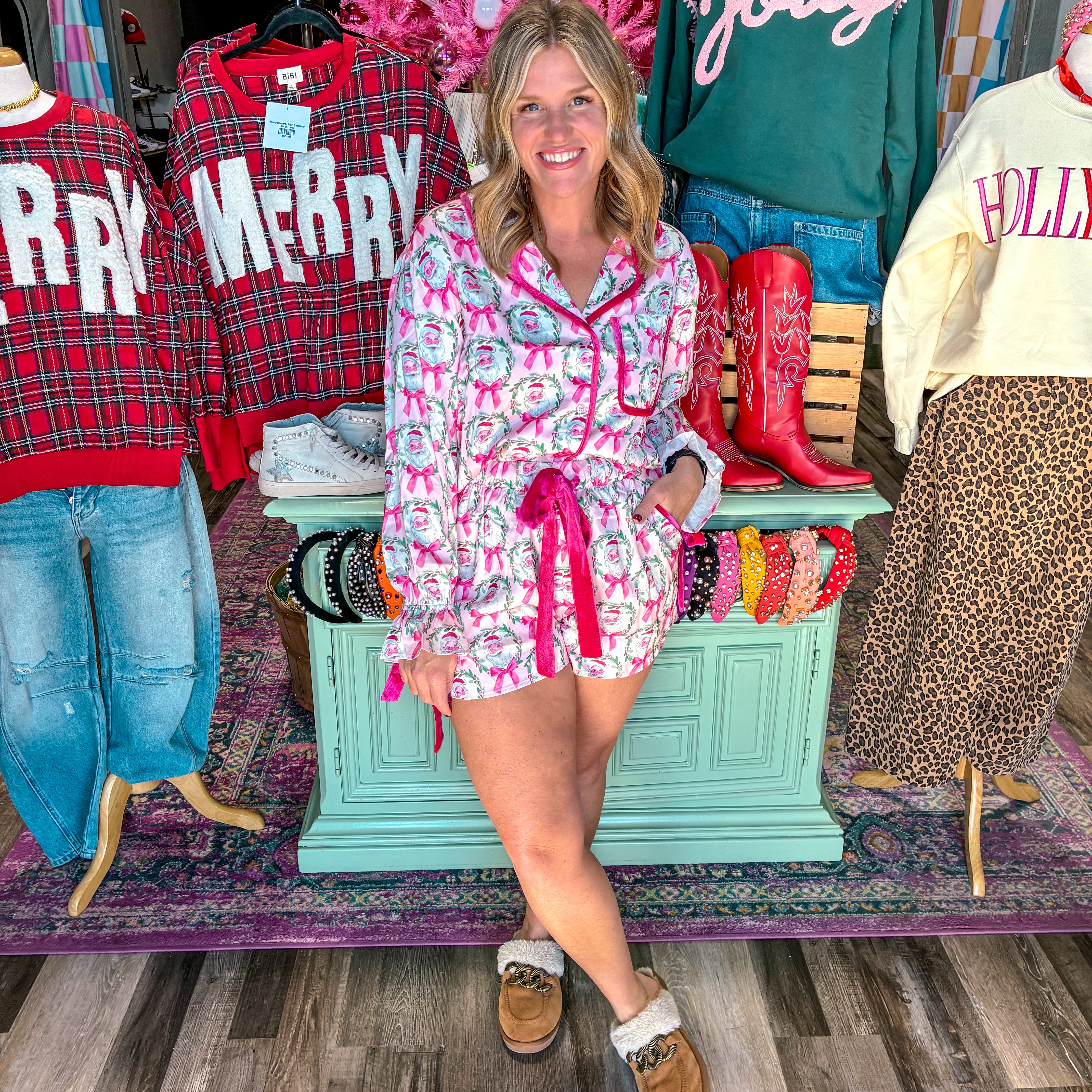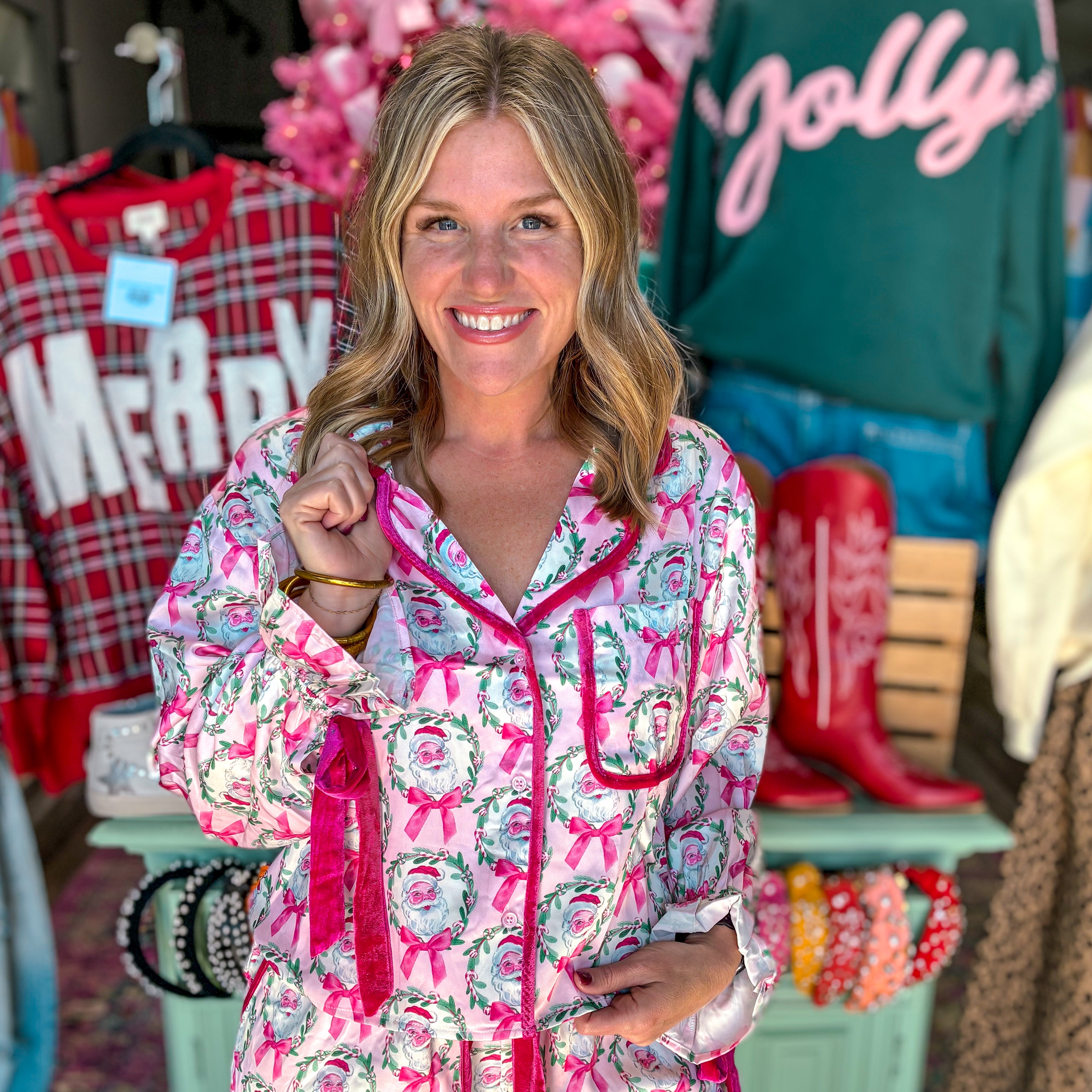 Experience holiday elegance with Santa's Bow Satin Pajamas, featuring smooth satin fabric adorned with charming Santa and bow prints. The velvet piping adds a refined texture contrast, enhancing both comfort and style for restful, festive nights. Perfect for those seeking luxurious seasonal sleepwear with expert craftsmanship.