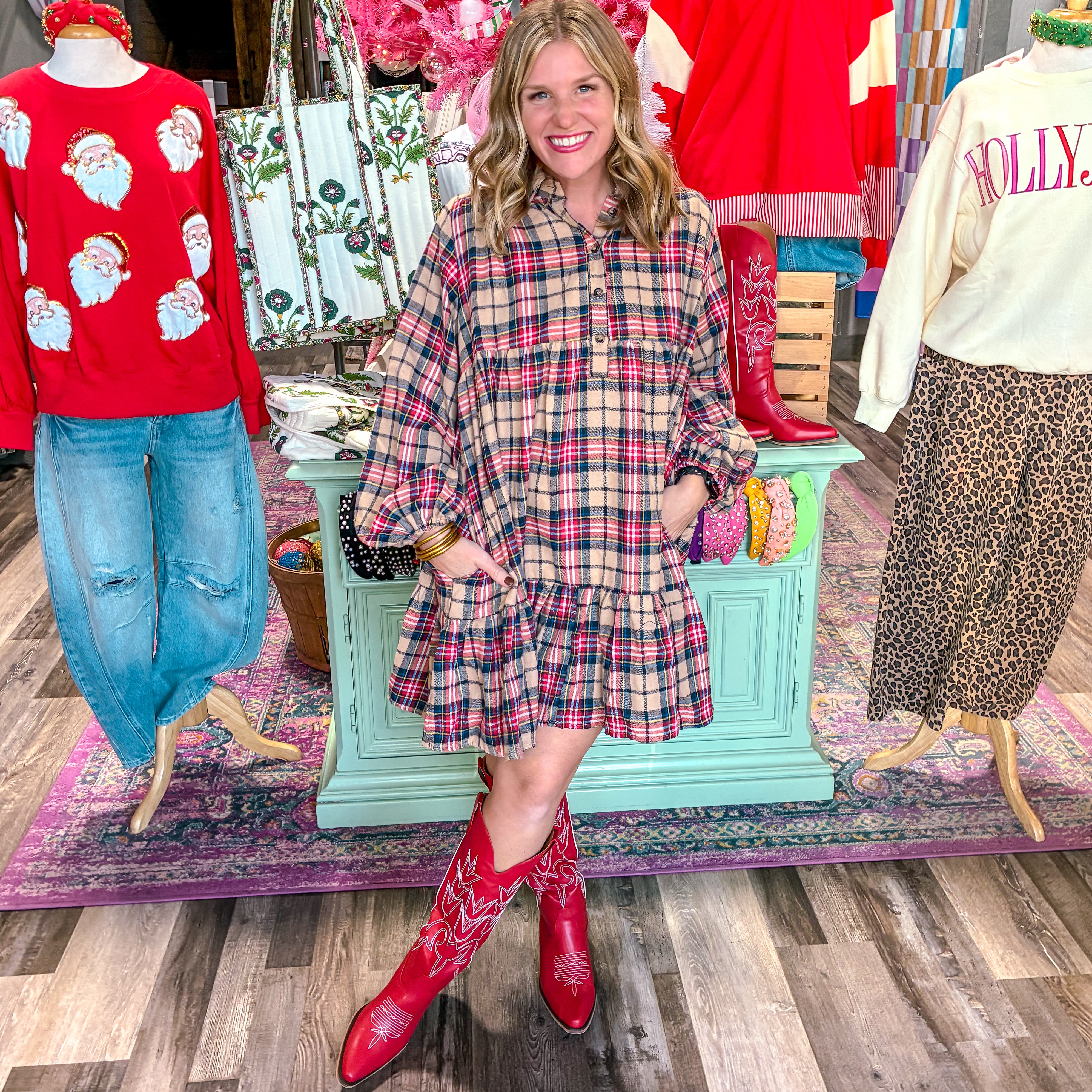 The Sweet Pines Plaid Tiered Dress in Camel combines classic styling with contemporary flair. This woven plaid design features a flattering tiered silhouette that creates movement and dimension. The rich hunter green palette offers versatility for both casual and dressed-up occasions. Perfect for layering or wearing solo, this piece transitions seamlessly from season to season. The structured plaid pattern adds visual interest while the tiered construction provides comfortable, forgiving fit. An essential addition to any wardrobe seeking timeless appeal with modern sensibility.