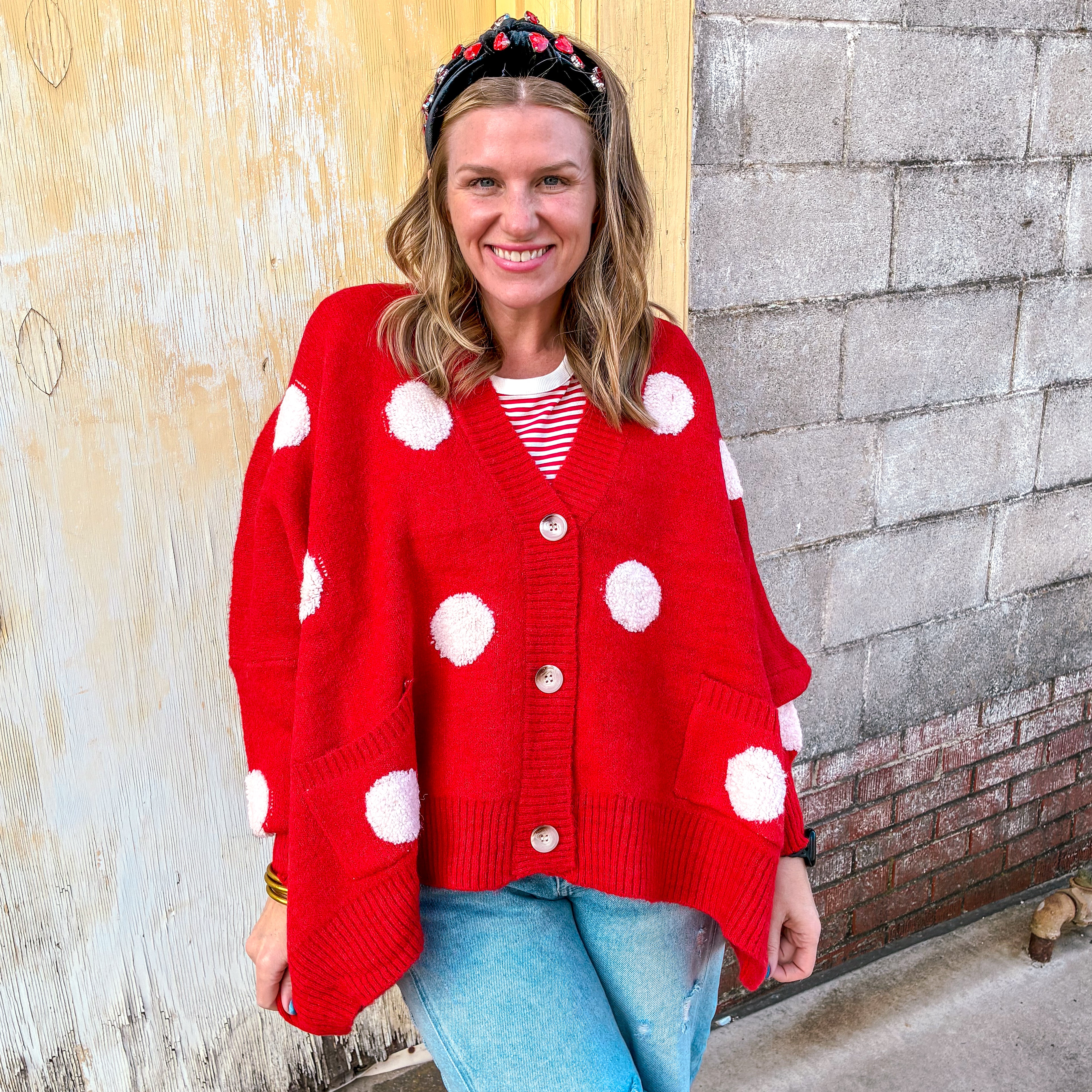 Elevate your casual wardrobe with this striking red oversized cardigan, featuring classic polka dots that blend vintage charm with contemporary style. The relaxed fit provides effortless comfort and versatility, layering seamlessly over tees, dresses, or worn open as a statement piece. Crafted for those who appreciate timeless patterns with modern proportions, this pullover cardigan delivers both warmth and personality to any seasonal look.