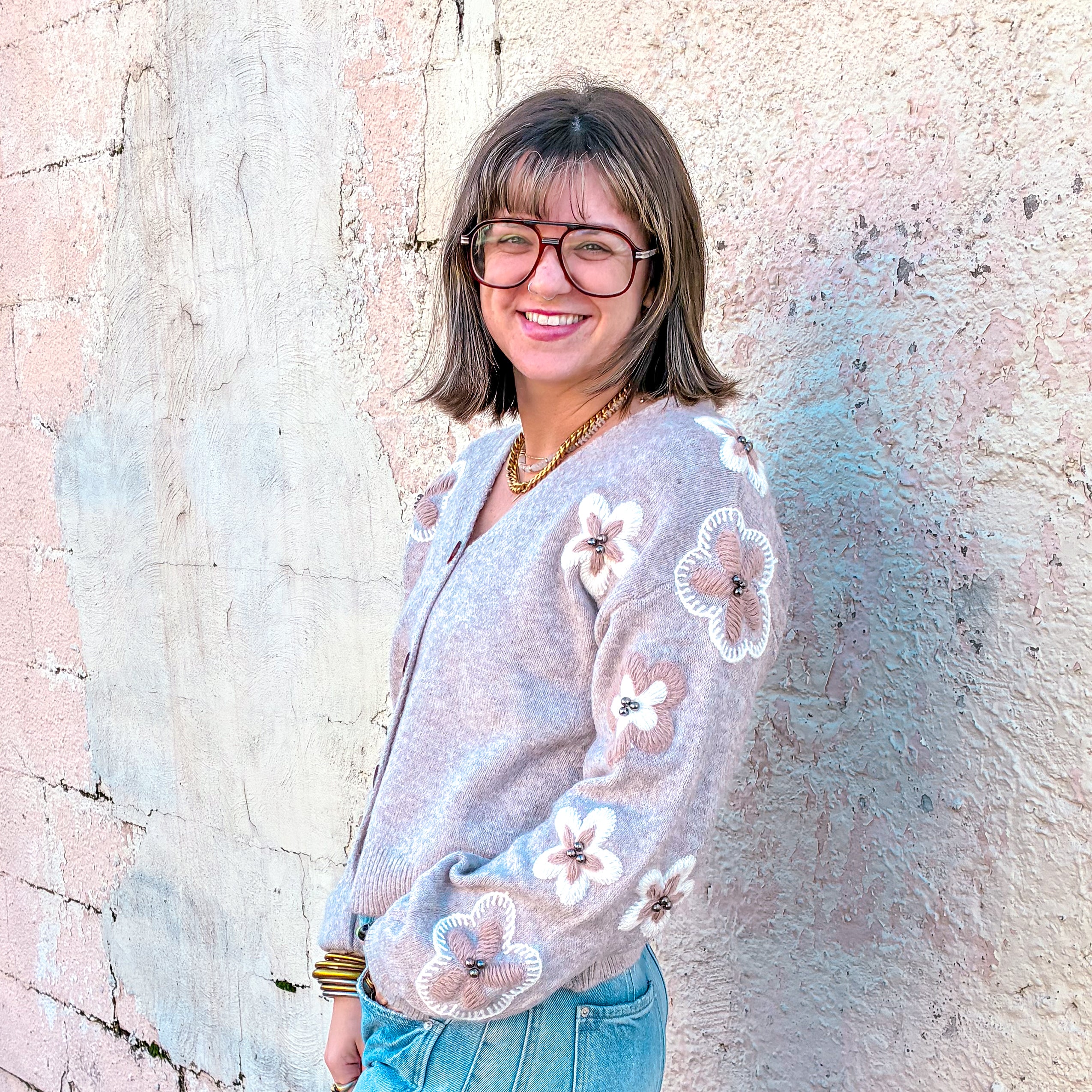 This taupe blossom cardigan features delicate floral designs on the sleeves, adding a touch of elegance and femininity to any outfit. Made from high-quality materials, this cardigan is perfect for adding a cozy and stylish layer to your wardrobe. Stay warm and on-trend with our Taupe Blossom Cardigan.