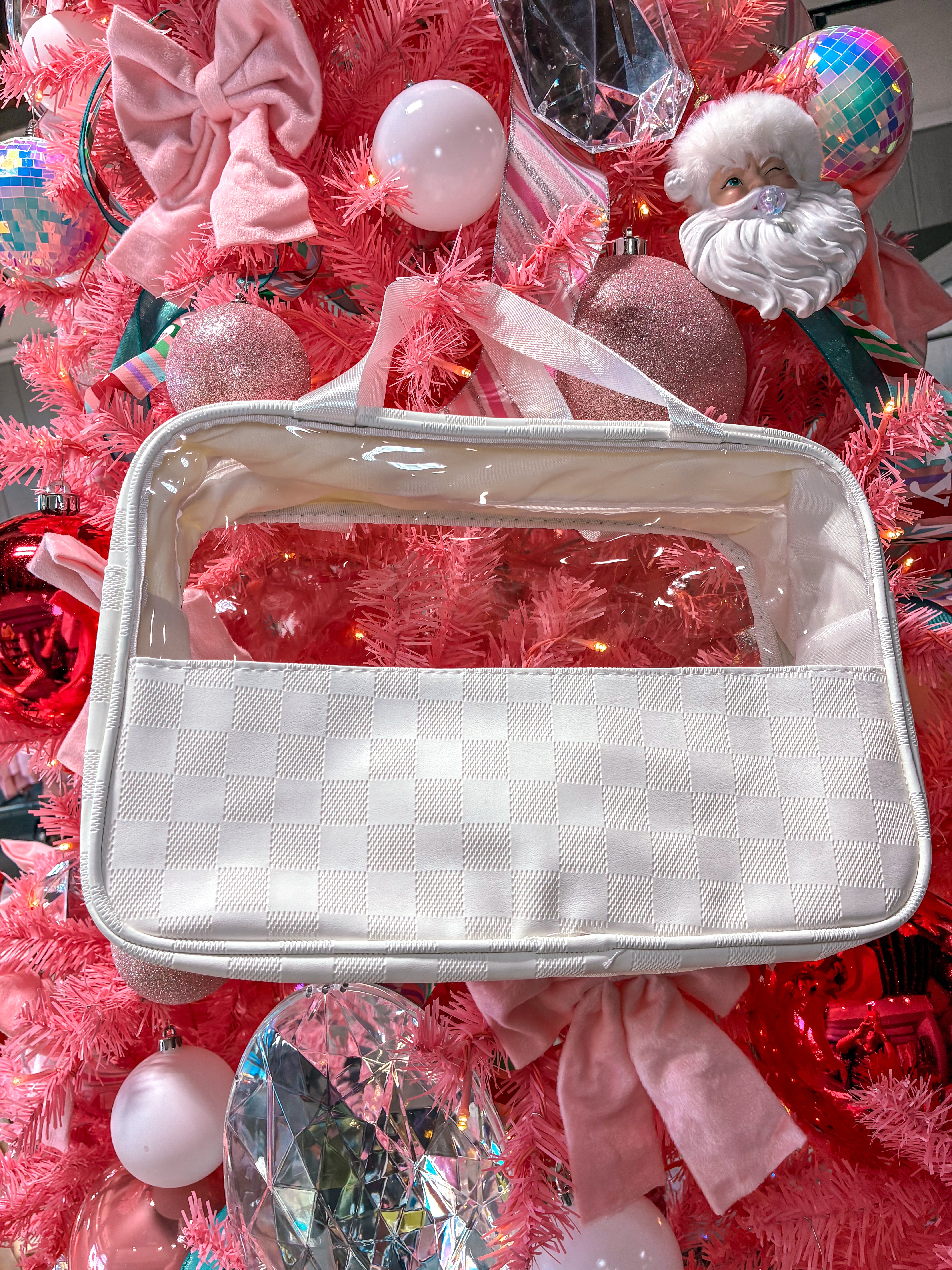 The Clear Check Travel Tote combines practical functionality with sophisticated style. This water-resistant bag features a distinctive checkered monogram design and offers ample storage space across its 12" length, 8" height, and 4" depth. The smooth zipper closure ensures secure packing for all your travel essentials, while its sturdy construction maintains its shape through frequent use. Whether you're heading to the airport or a weekend getaway, this versatile tote delivers both durability and elegance in one essential accessory.