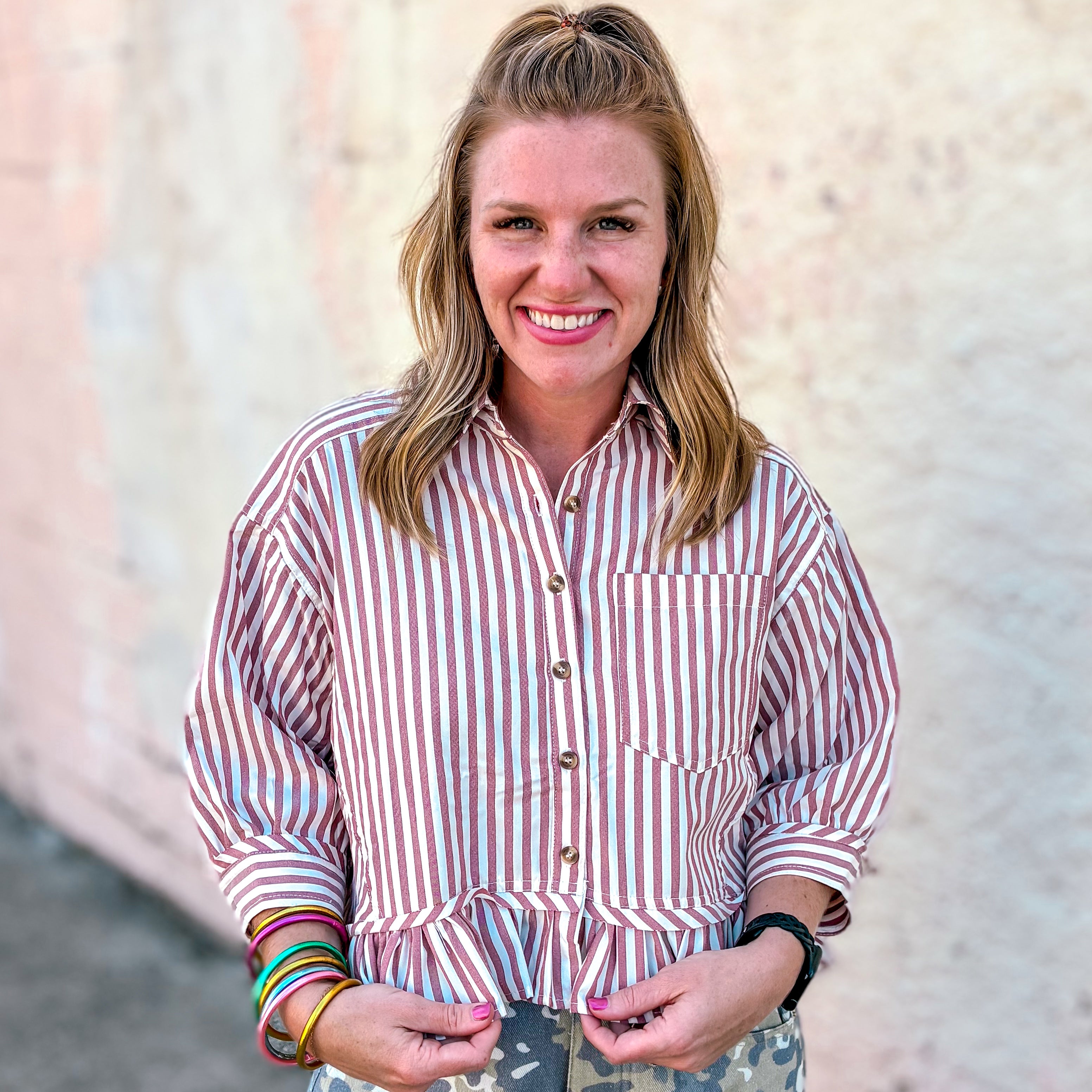 The Willow Ruffle Top combines timeless wine-colored stripes with a refined ruffle hem for subtle movement and flair. This button-up blouse offers a polished silhouette ideal for both office settings and casual outings, delivering effortless style with expert tailoring and versatile elegance.