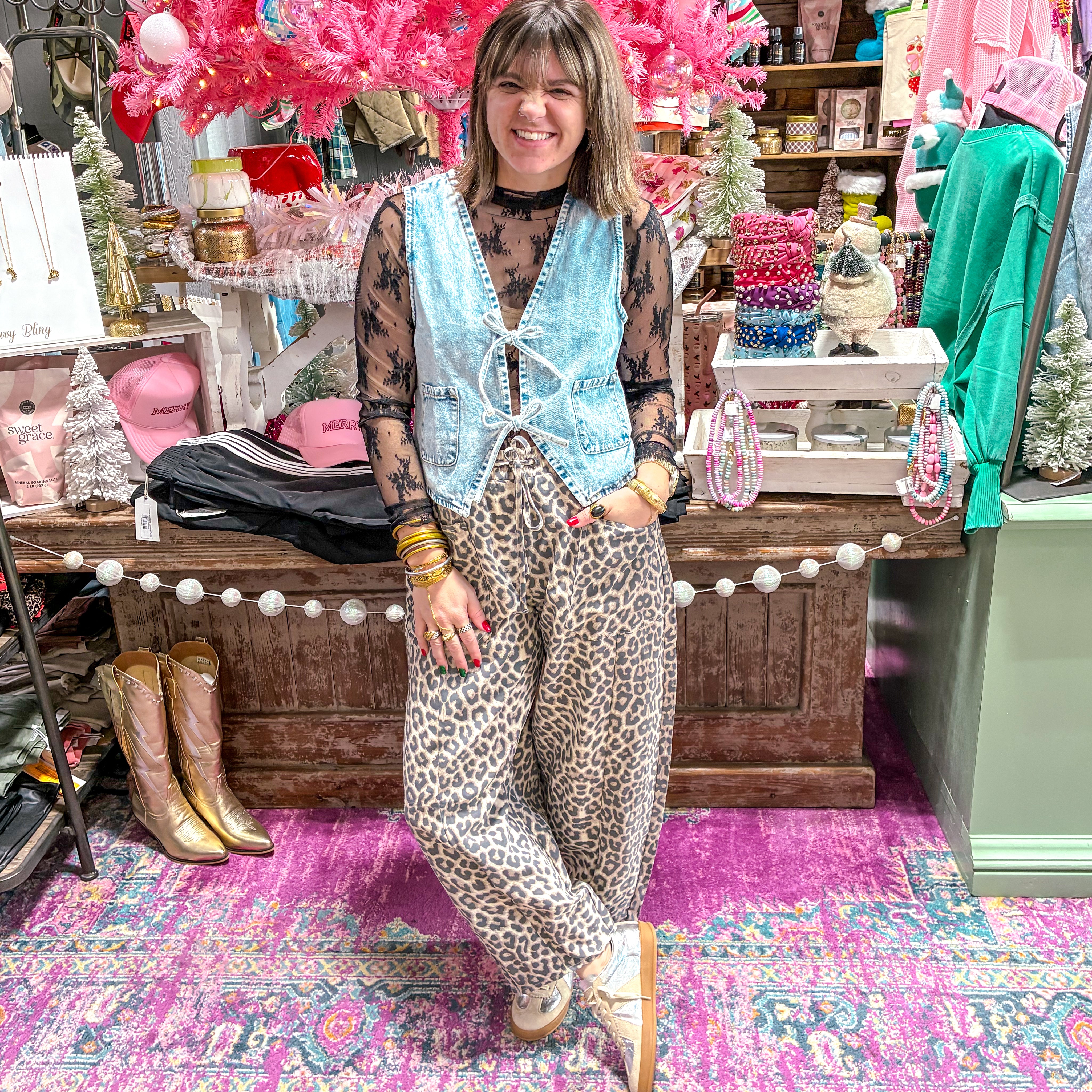 Urban Leopard Barrel Pants combine contemporary silhouette with timeless animal print. The elastic waistband delivers all-day comfort without sacrificing style, while the barrel leg cut offers a modern, relaxed fit that works across casual and elevated looks. Crafted for versatility, these pants transition seamlessly from weekend wear to layered outfits. The leopard pattern adds visual interest to neutral bases, making them a practical wardrobe staple for those seeking effortless sophistication.